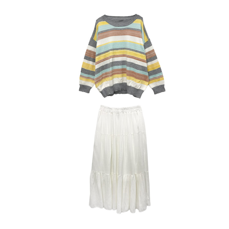 / 復古甜美軟糯不起球彩虹毛衣+小清新雪紡高腰半身裙套裝兩件套潮