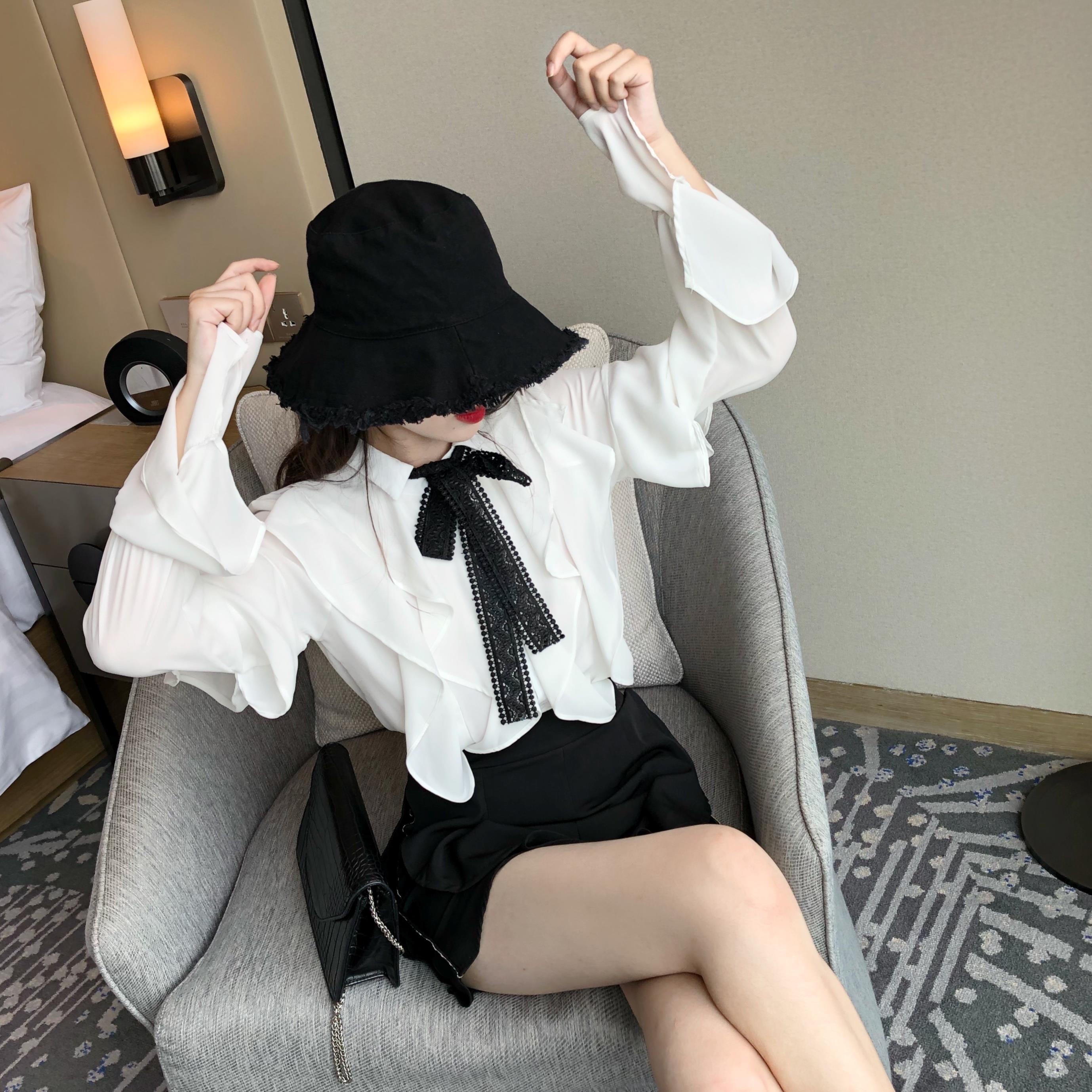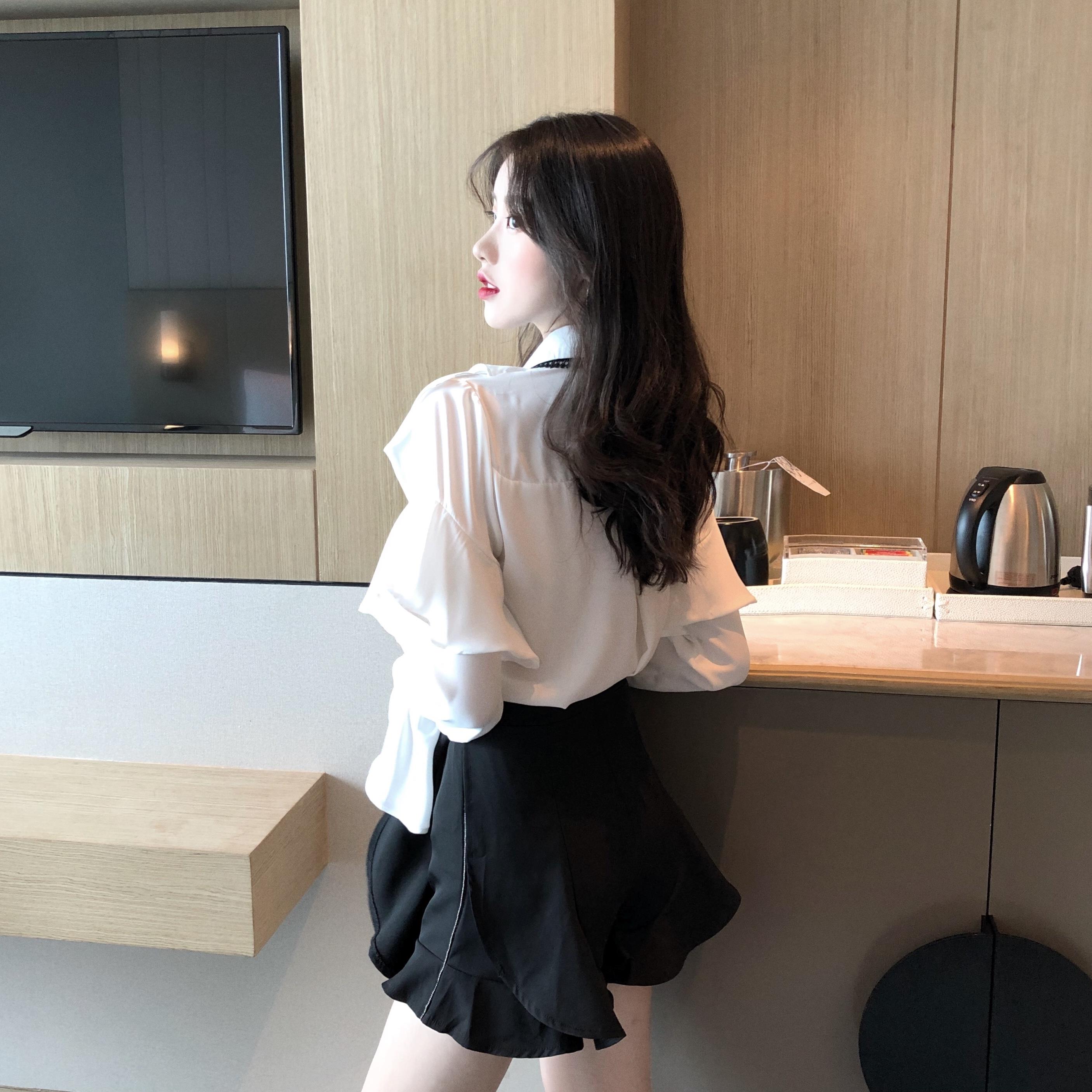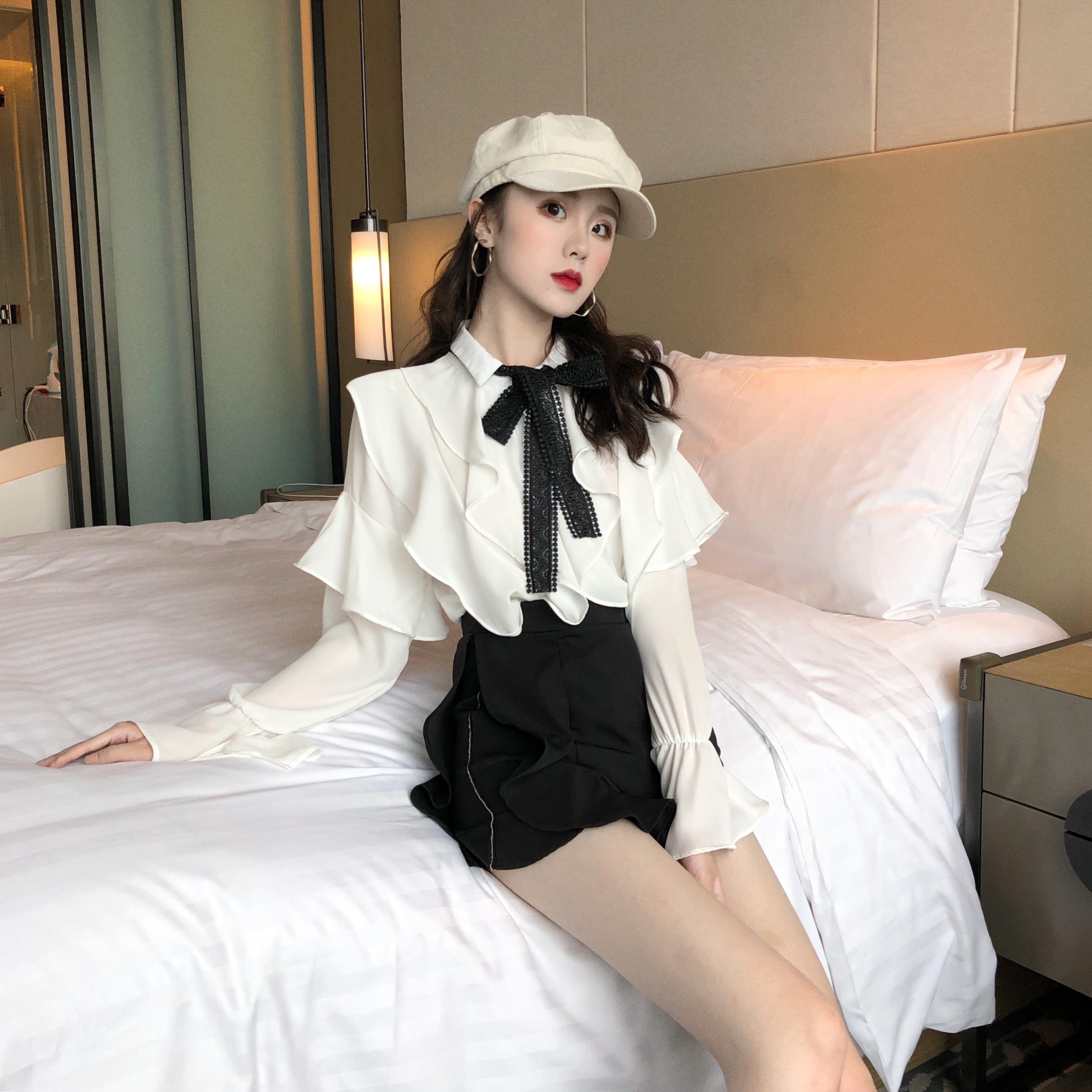 港味氣質網紅同款荷葉邊蕾絲領結襯衣設計感大長腿短褲時尚套裝女