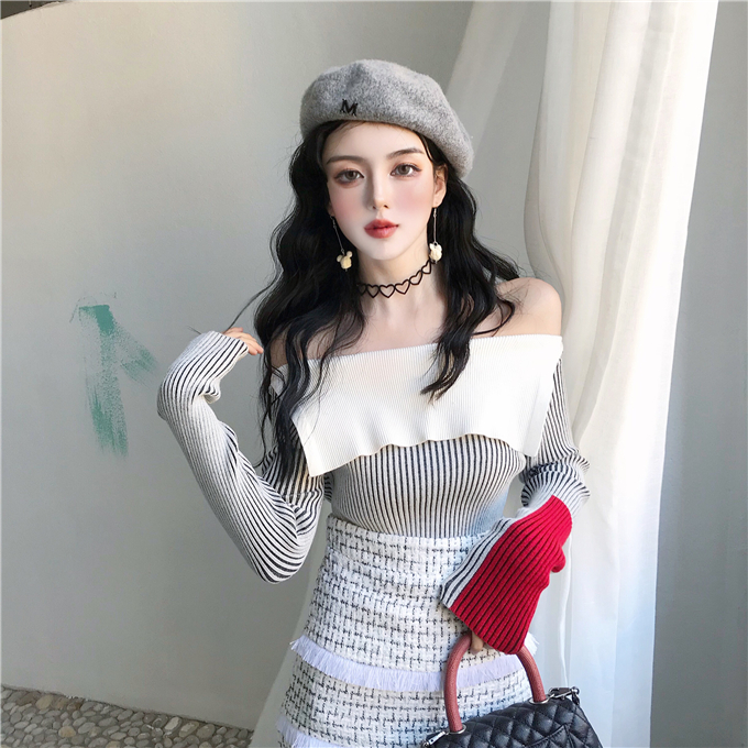 / 時尚一字肩上衣翻領露肩條紋長袖針織衫+流蘇邊粗花呢包臀半身裙