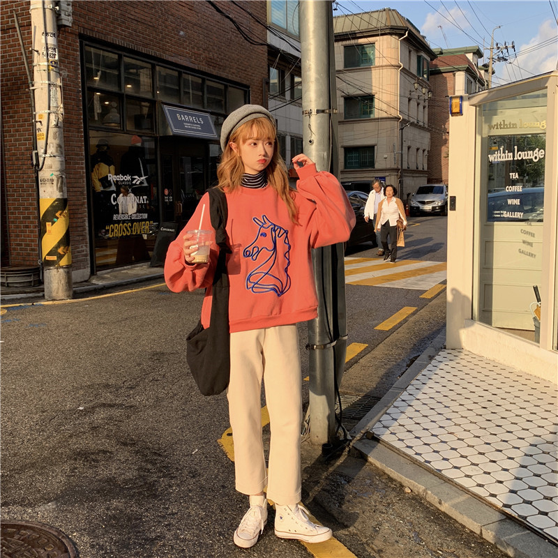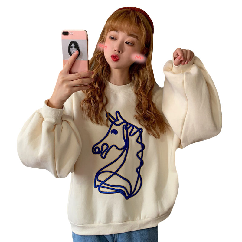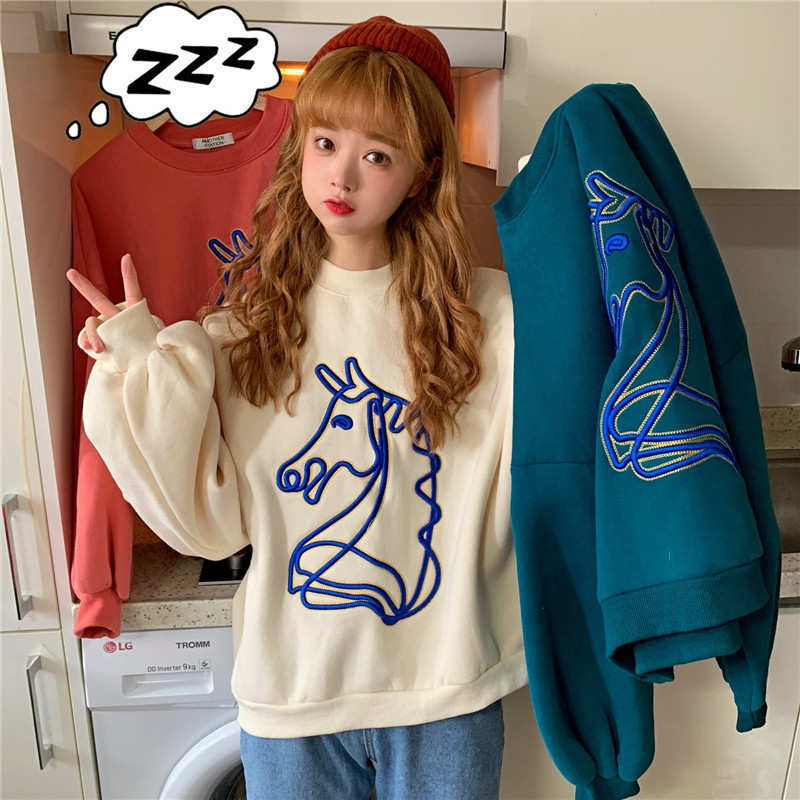 2018新款秋冬韓版寬松慵懶風小馬刺繡加絨加厚套頭衛衣上衣外套女