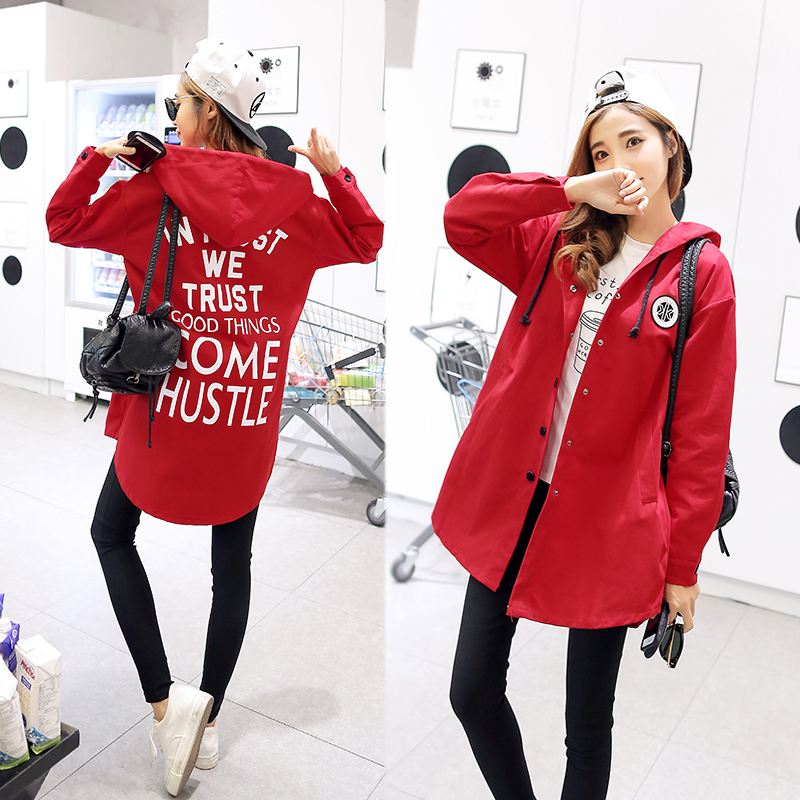 春秋裝新款韓版BF學生中長款休閑寬松大碼連帽風衣工裝外套女