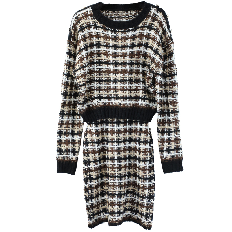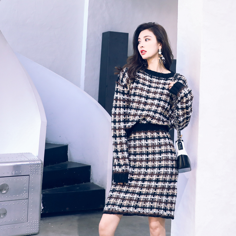 網紅時尚半身裙套裝女2018秋冬新款氣質百搭格子針織高腰半身裙