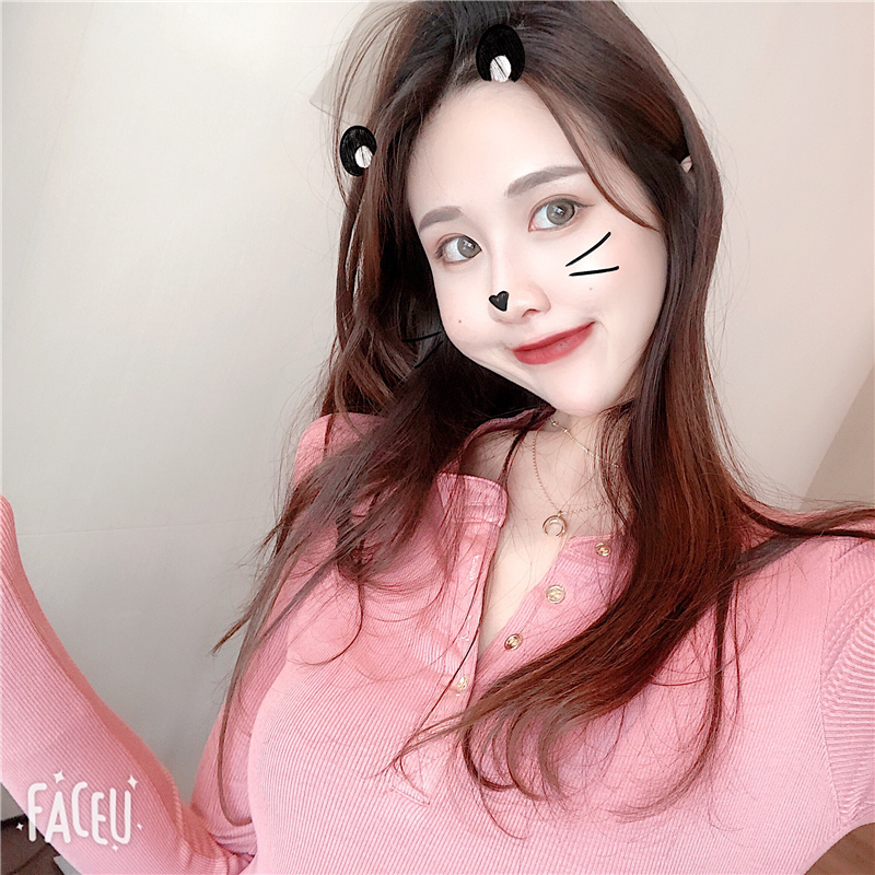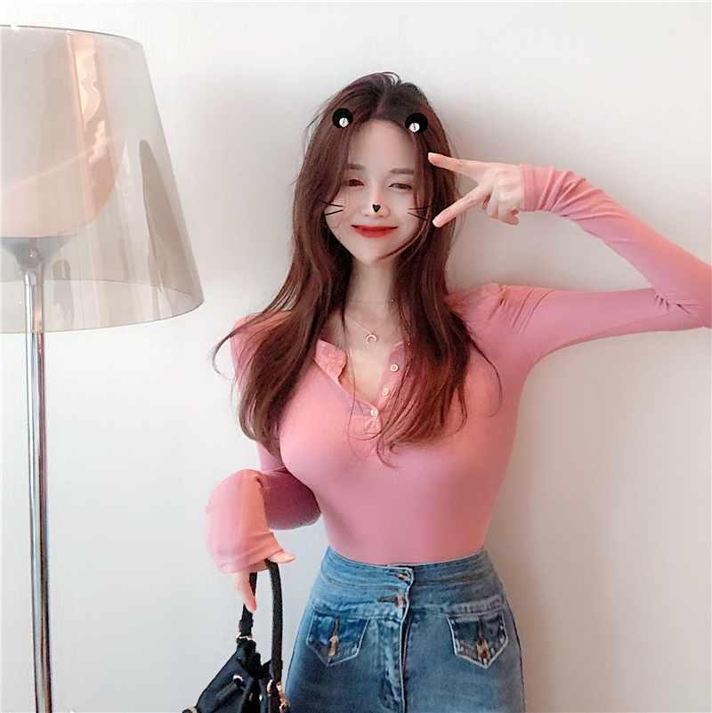 chic早秋上衣女2018新款韓風百搭紐扣復古氣質顯瘦長袖T恤打底衫