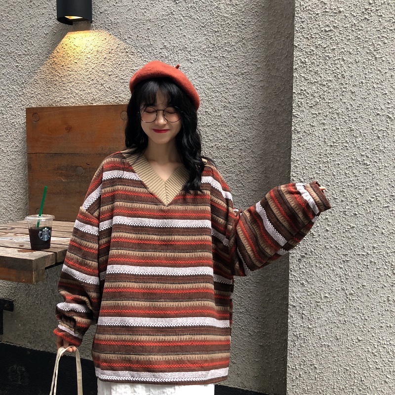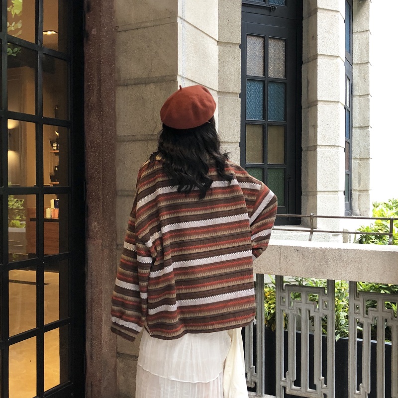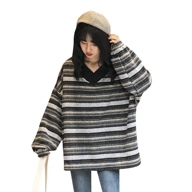 / 秋季韓版中長款港味復古條紋毛呢寬松pp home超火衛衣上衣外套女