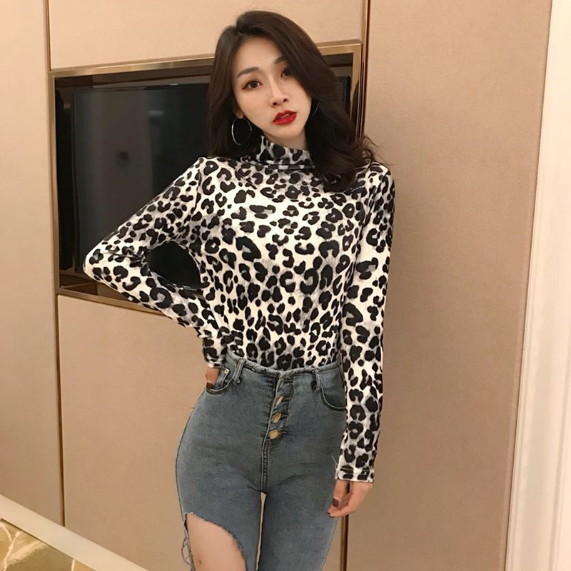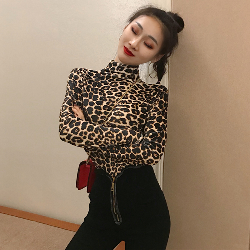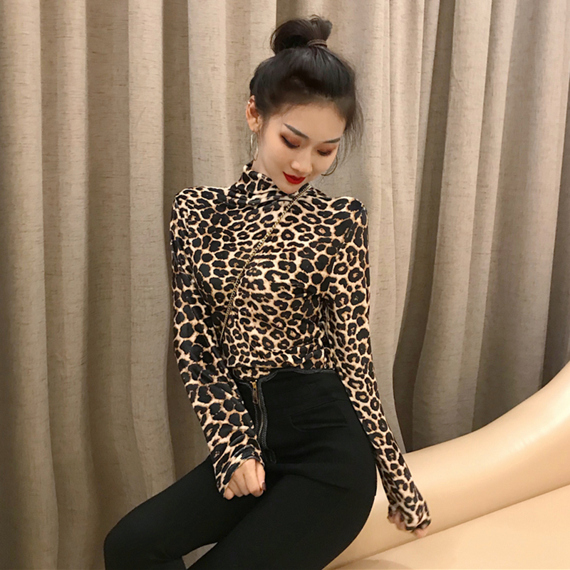 / 秋冬2018新款女裝港味復古豹紋長袖T恤氣質修身高領金絲絨打底衫