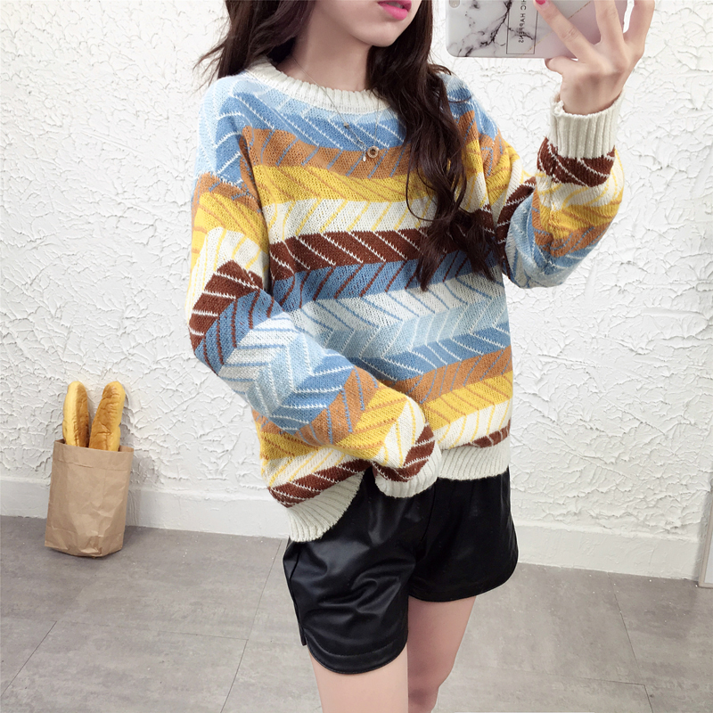 / 學生撞色毛衣外套女秋冬裝2018新款韓版百搭寬松長袖套頭針織衫潮