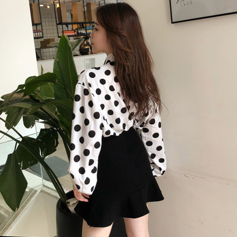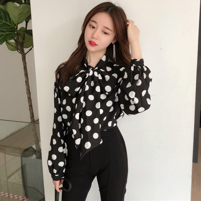 / 秋新款成熟風氣質冷系女裝蝴蝶結白色波點長袖系帶雪紡襯衫女