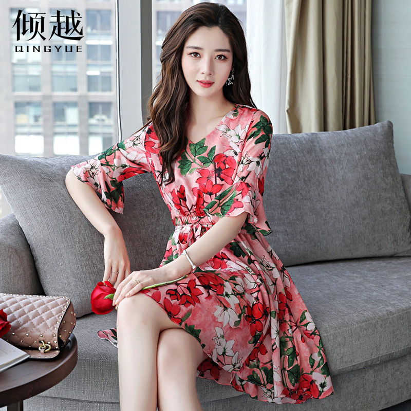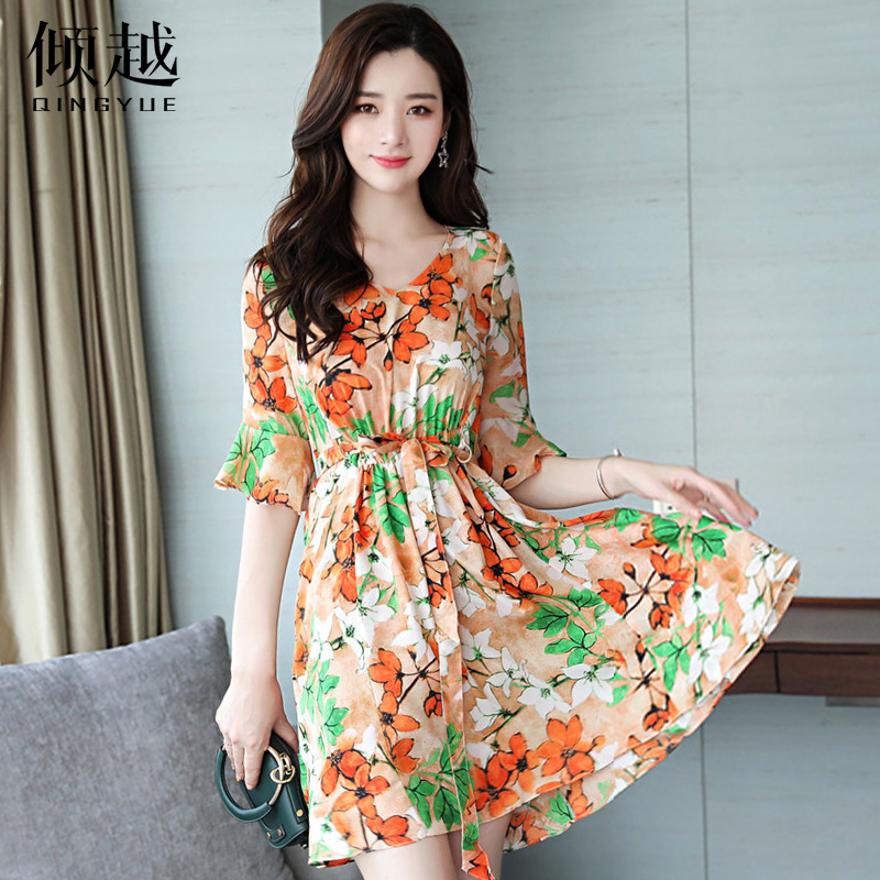 2017夏新款女裝雪紡連衣裙中袖碎花裙a字裙氣質淑女顯瘦印花裙子