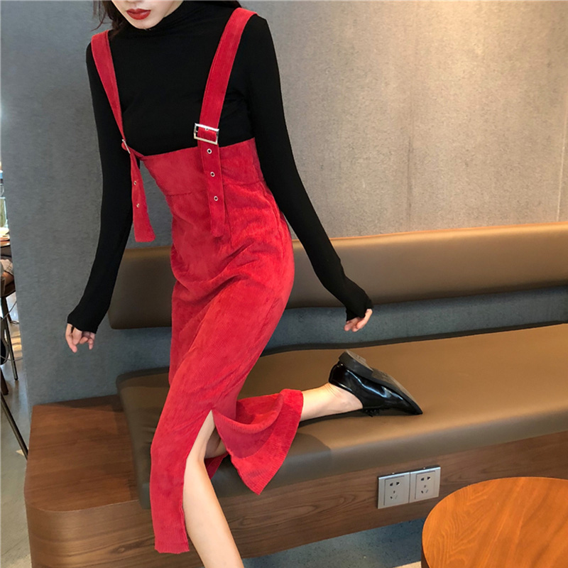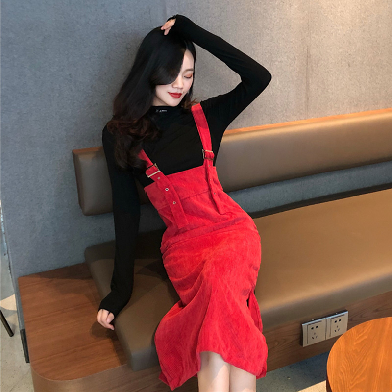 / 套裝女秋新款時尚字母針織T恤打底衫開叉黑色燈芯絨背帶連衣裙子