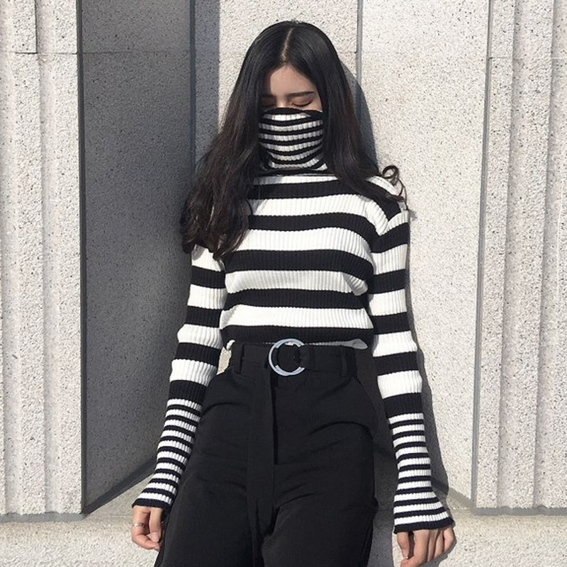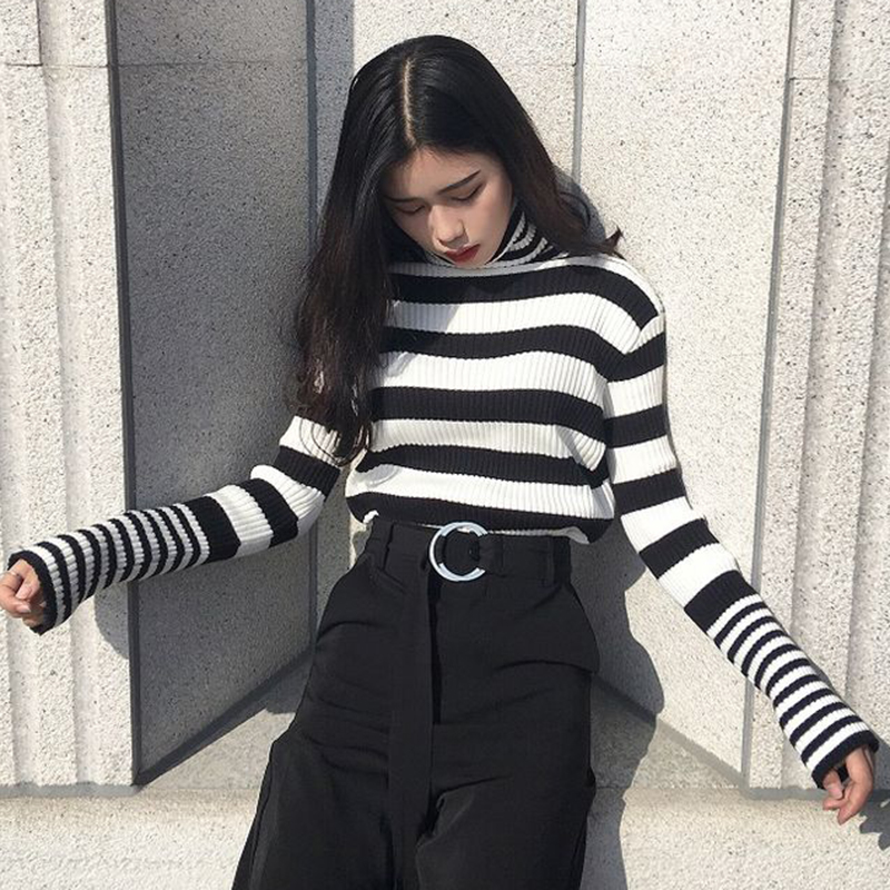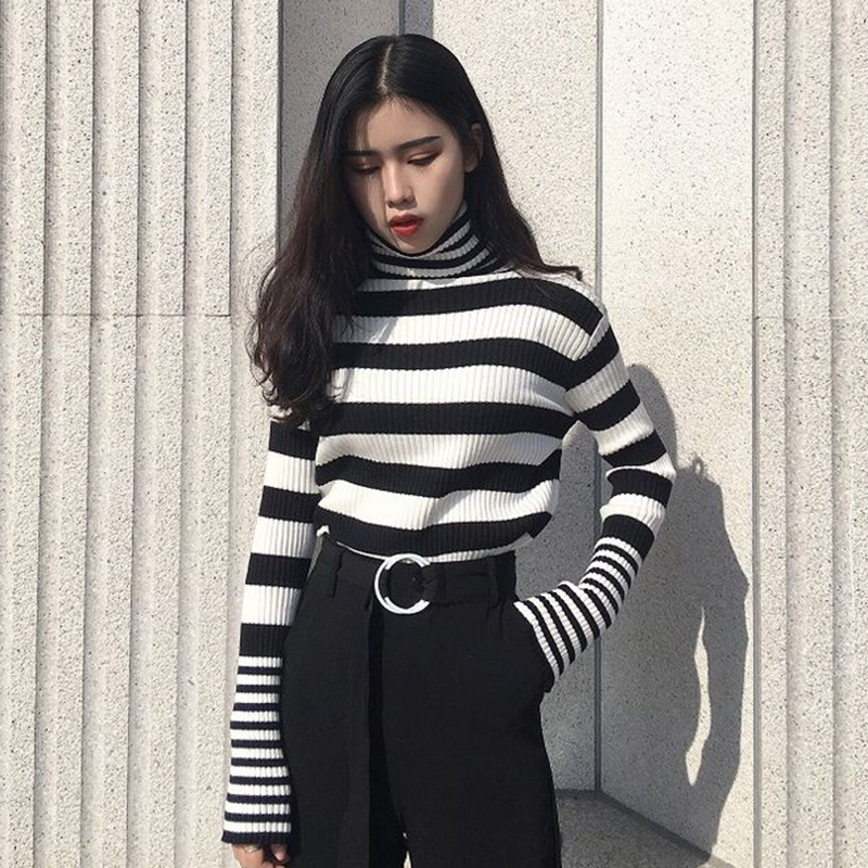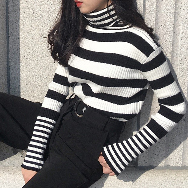 / 毛衣女秋冬裝2018新款時尚高領學生條紋打底針織衫休閑長袖上衣潮