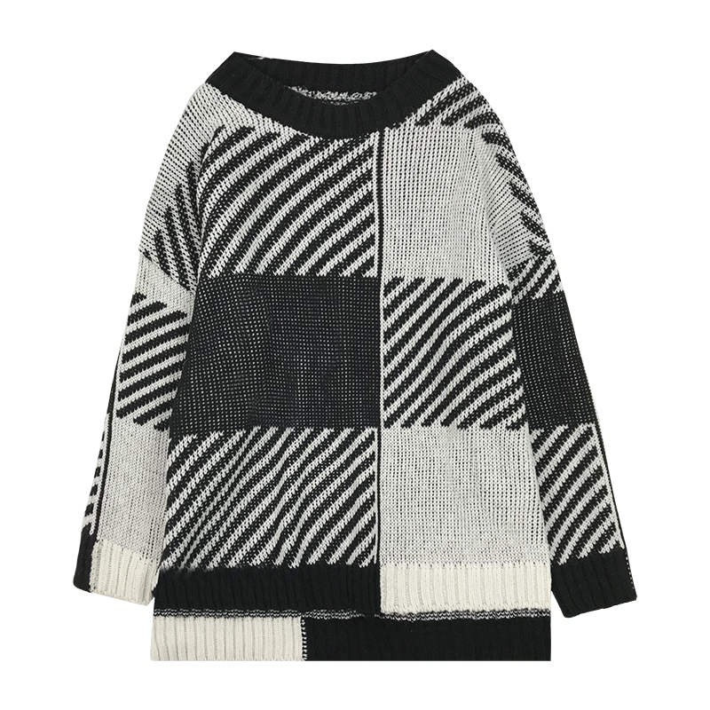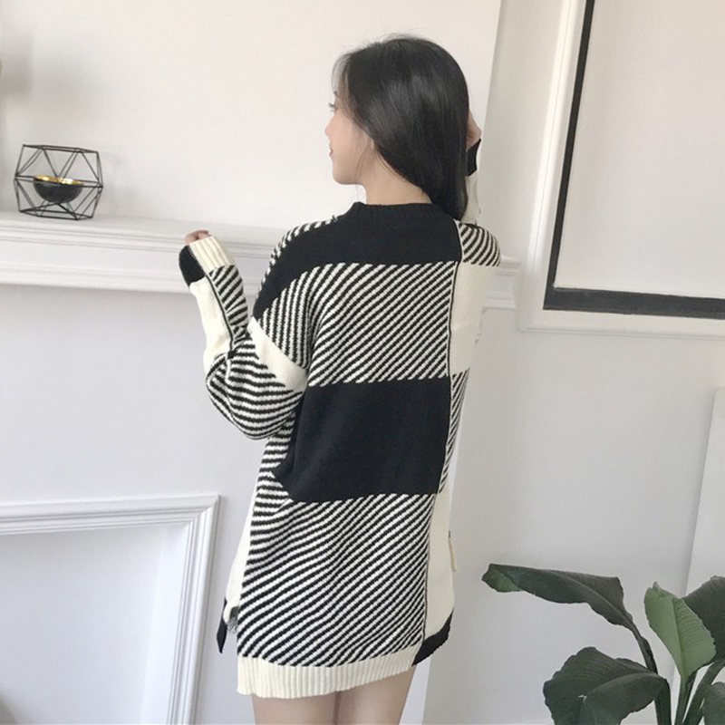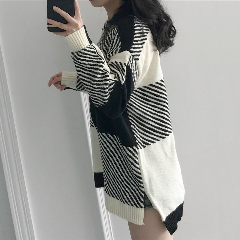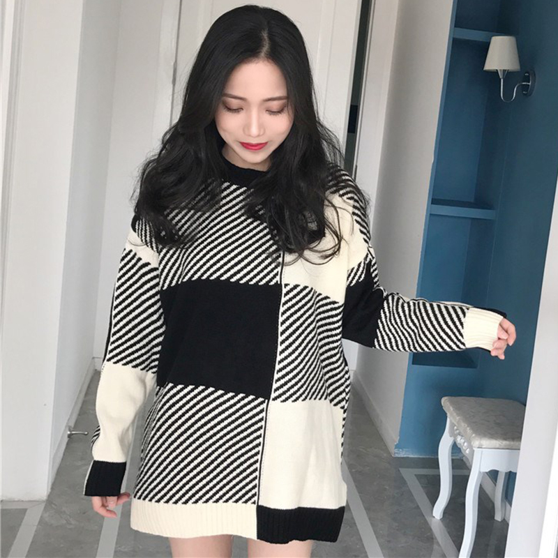 秋裝女2018新款寬松斜條紋格子長袖針織衫上衣小開叉套頭毛衣外套