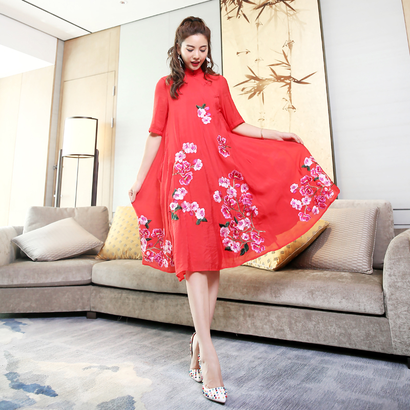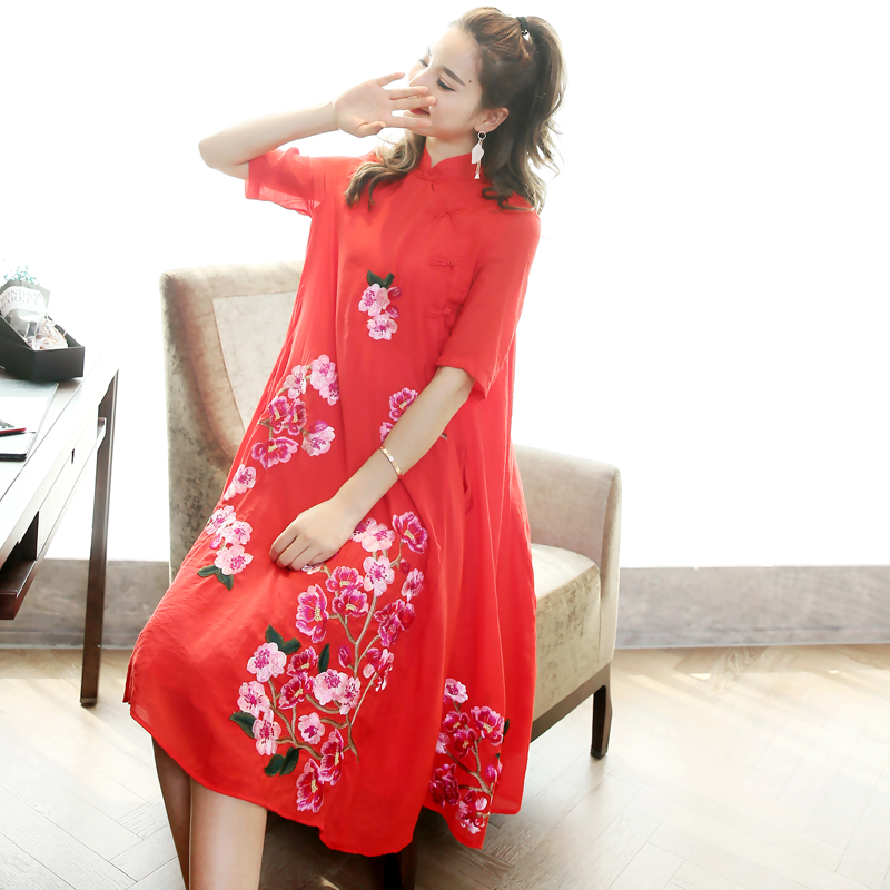 / 復古2018春夏季寬松繡花大擺日常連衣裙改良時尚氣質旗袍式中長款