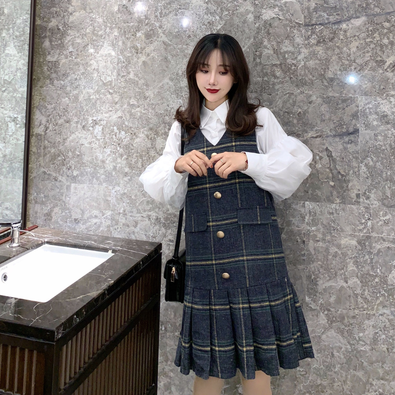/ 復古格子V領無袖呢子百褶背心連衣裙女+優雅長袖襯衫襯衣時尚套裝