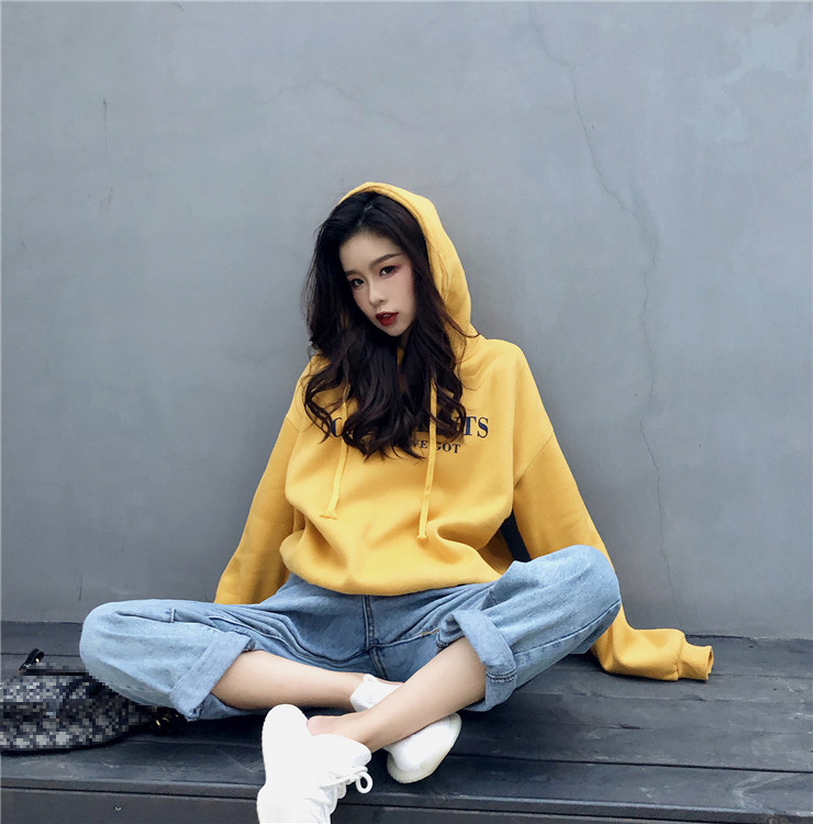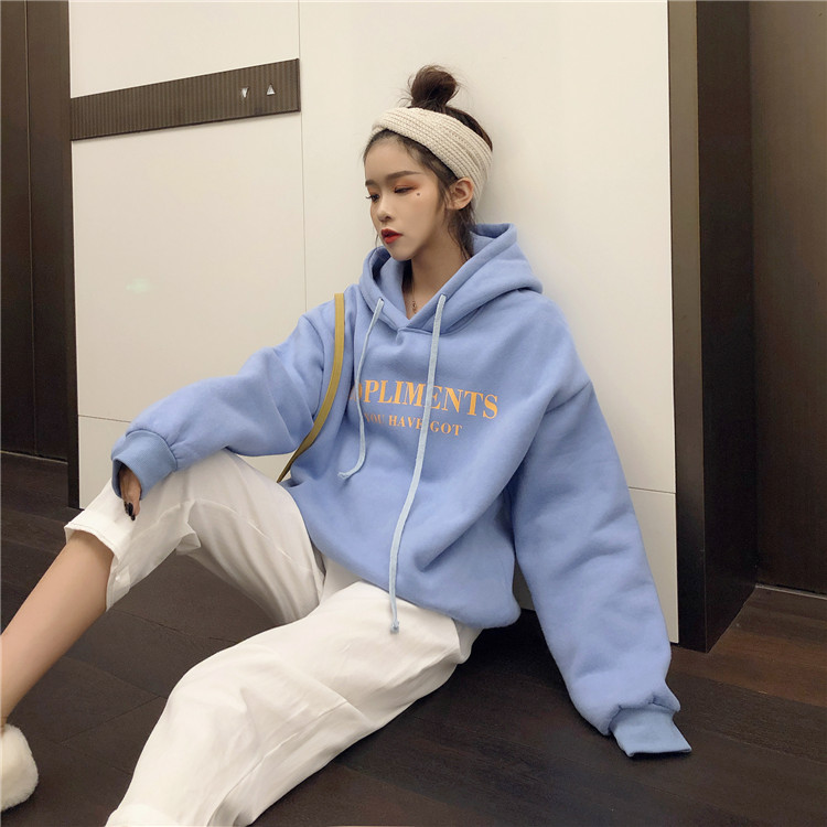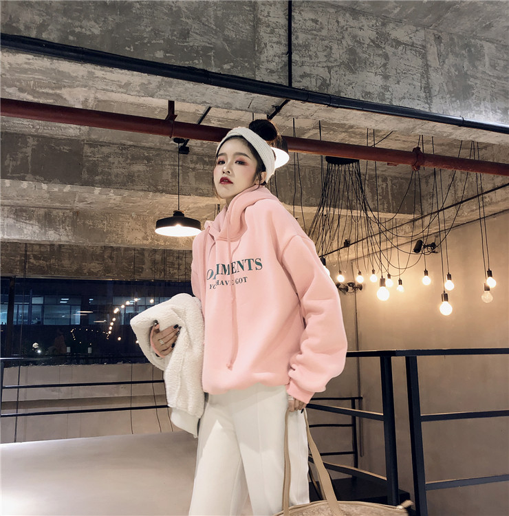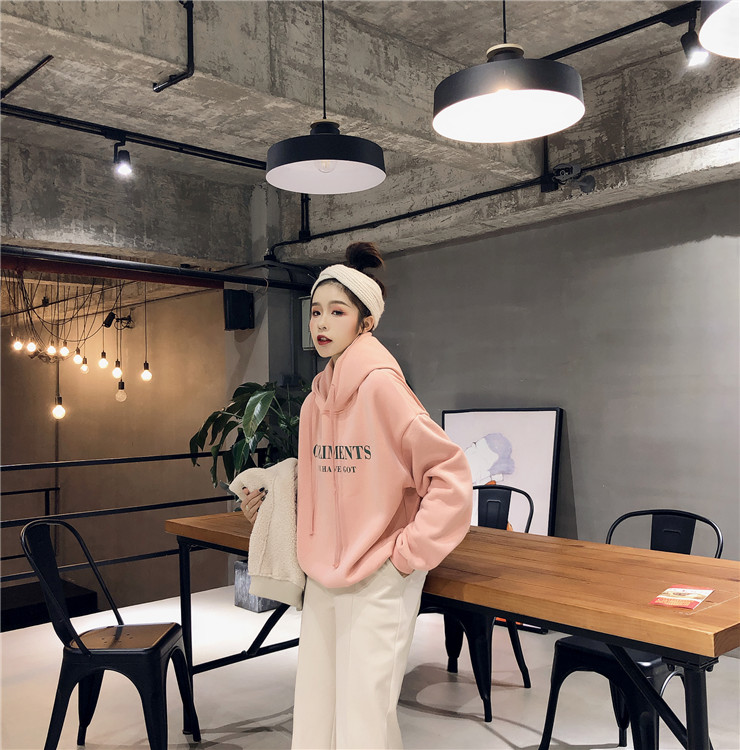 2018新款韓版小清新學生上衣連帽港風加絨新款慵懶秋冬印花衛衣女