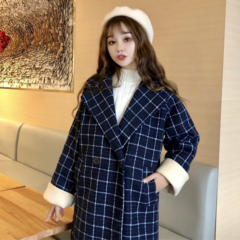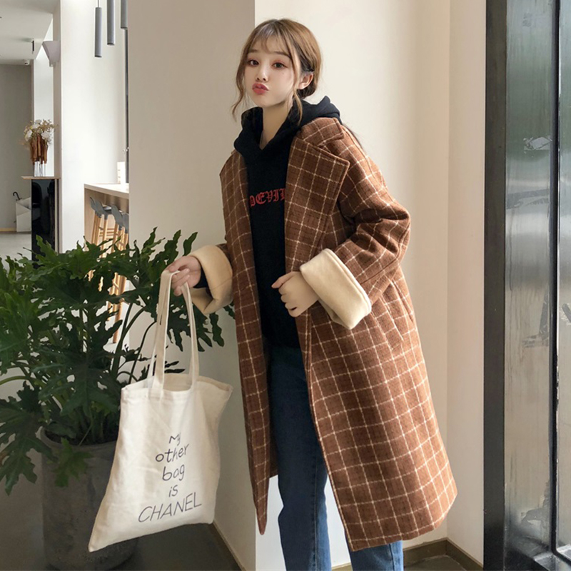 毛呢外套女裝中長款韓版2018流行秋冬季新款寬松夾棉加厚格子大衣