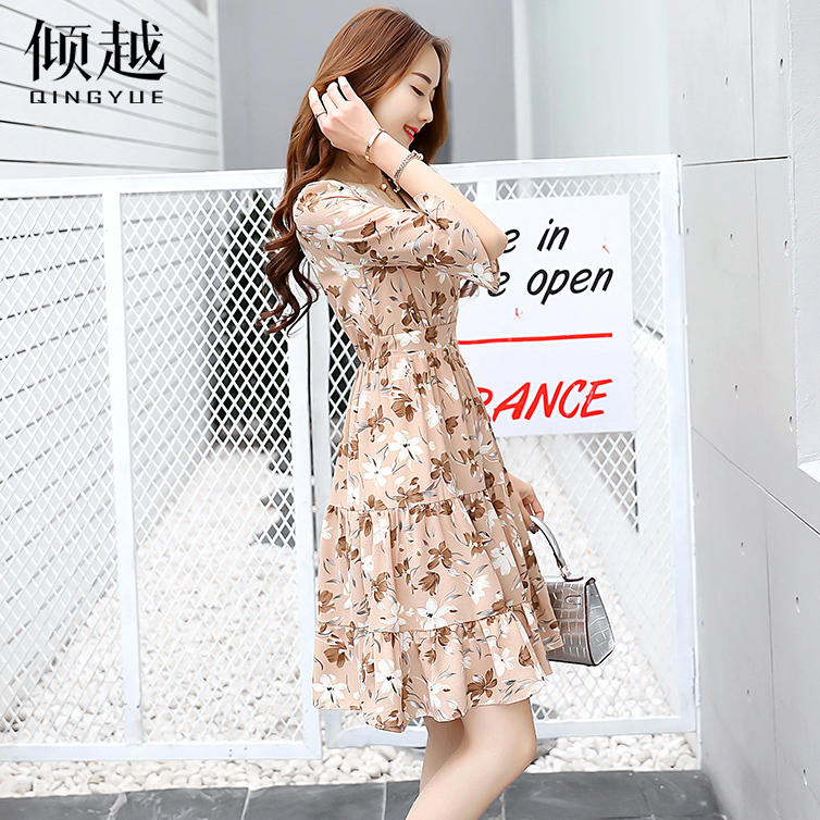 / 傾越2017夏季新款V領短袖碎花連衣裙中長款修身顯瘦雪紡裙子女潮