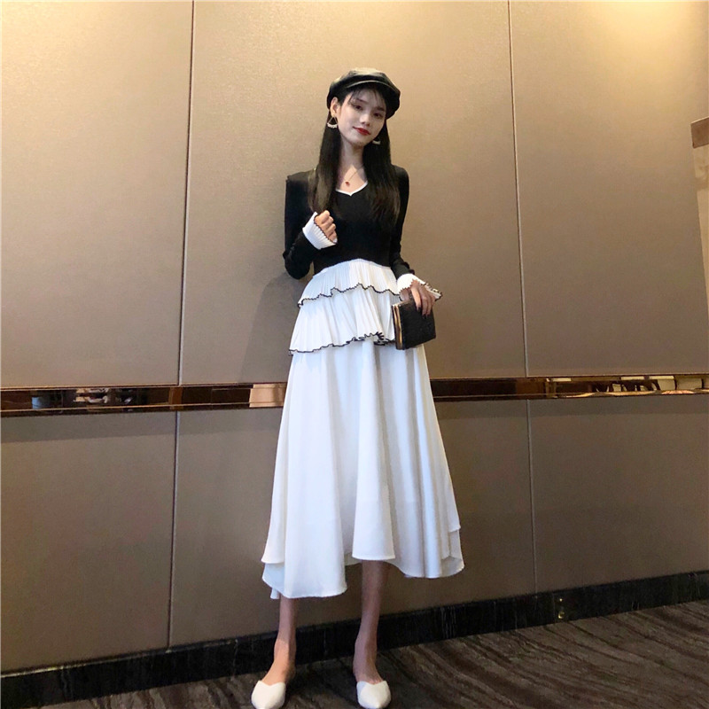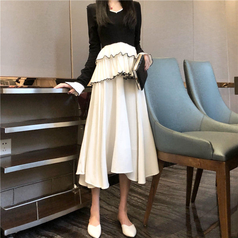 2018新款韓版氣質收腰修身V領中長款裙子女長袖赫本黑色連衣裙秋