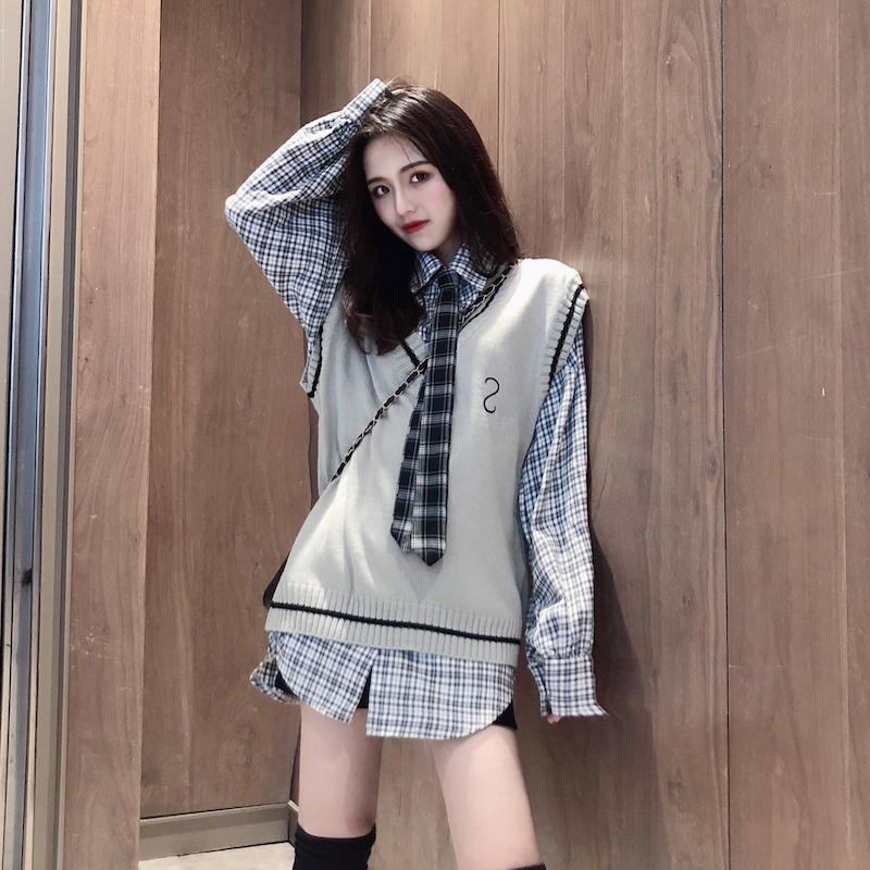 / 女神套裝秋冬新款復古V領字母刺繡毛衣馬甲+燈籠袖格子襯衫帶領帶