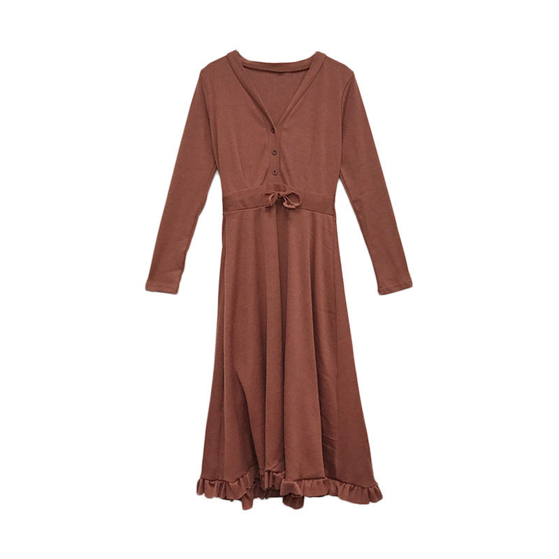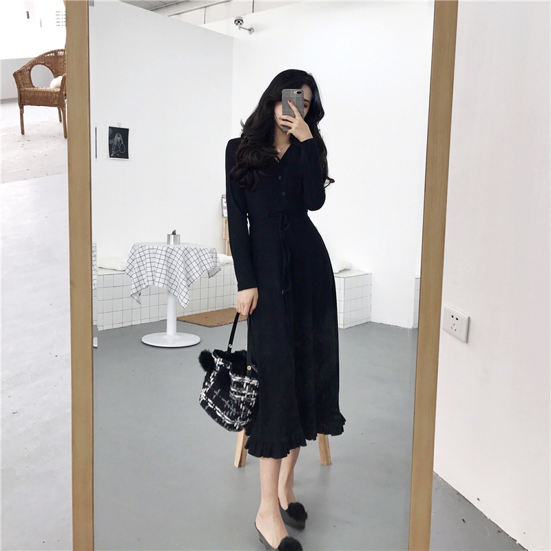 秋裝女2018新款顯瘦V領修身百搭長袖連衣裙收腰綁帶打底中長裙潮