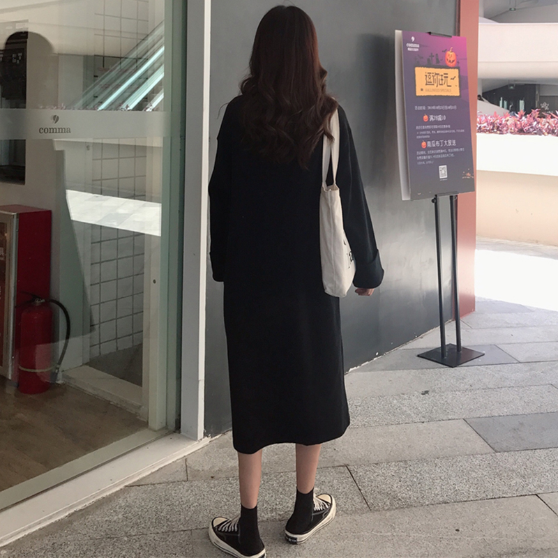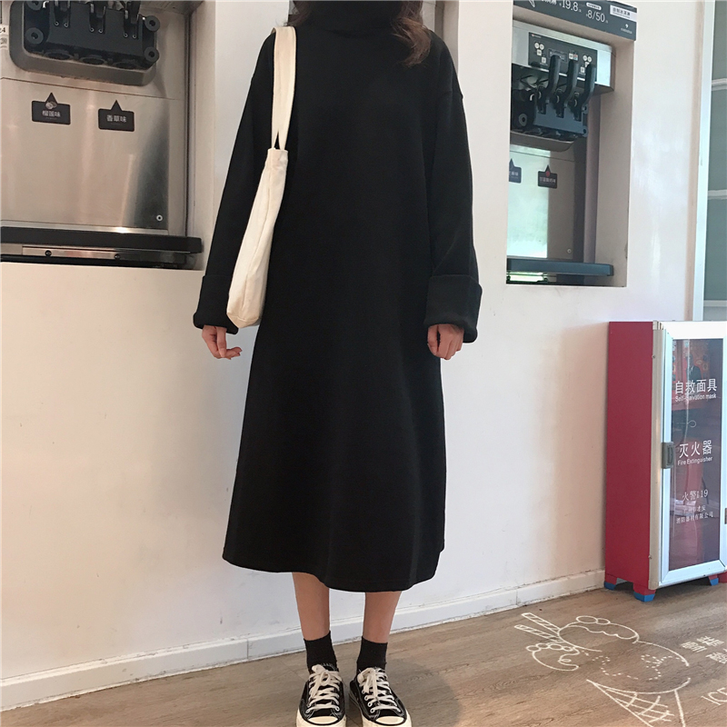 / 寬松高領學生黑色長袖連衣裙子女秋冬裝新款法式復古egg風衛衣裙