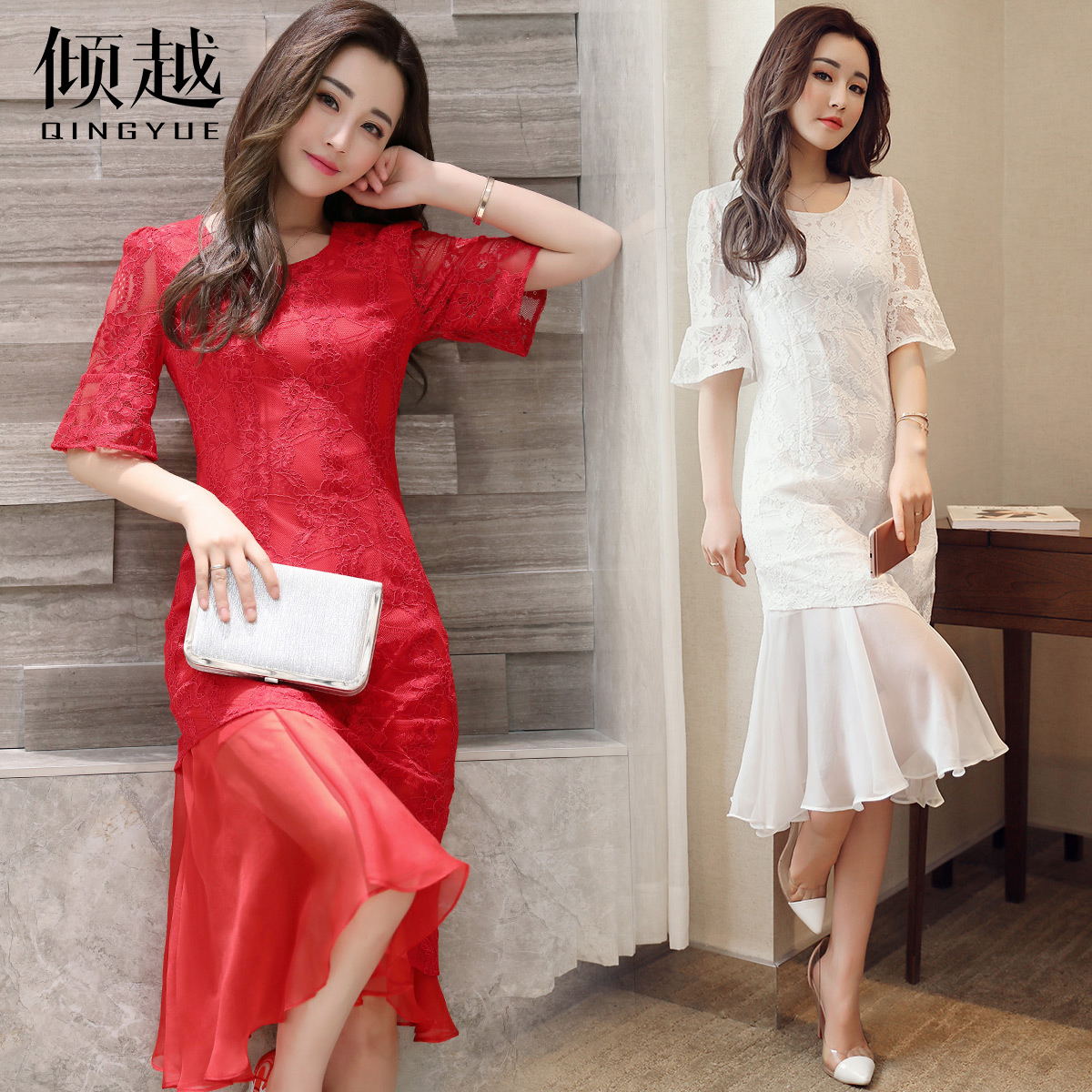 / 傾越2017夏季喇叭袖修身淑女顯瘦鏤空包臀收腰中長款蕾絲連衣裙潮
