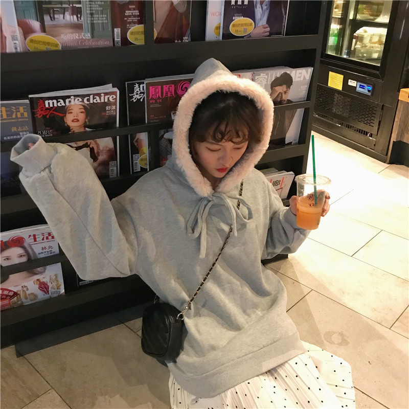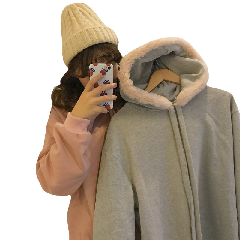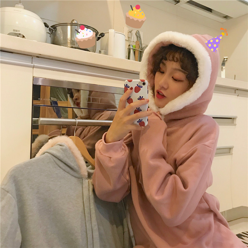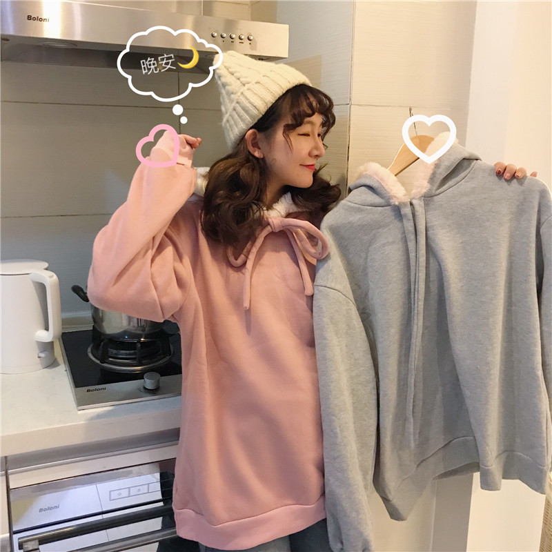 / 秋冬女裝韓版寬松毛領連帽加絨加厚pp home套頭超火衛衣上衣外套