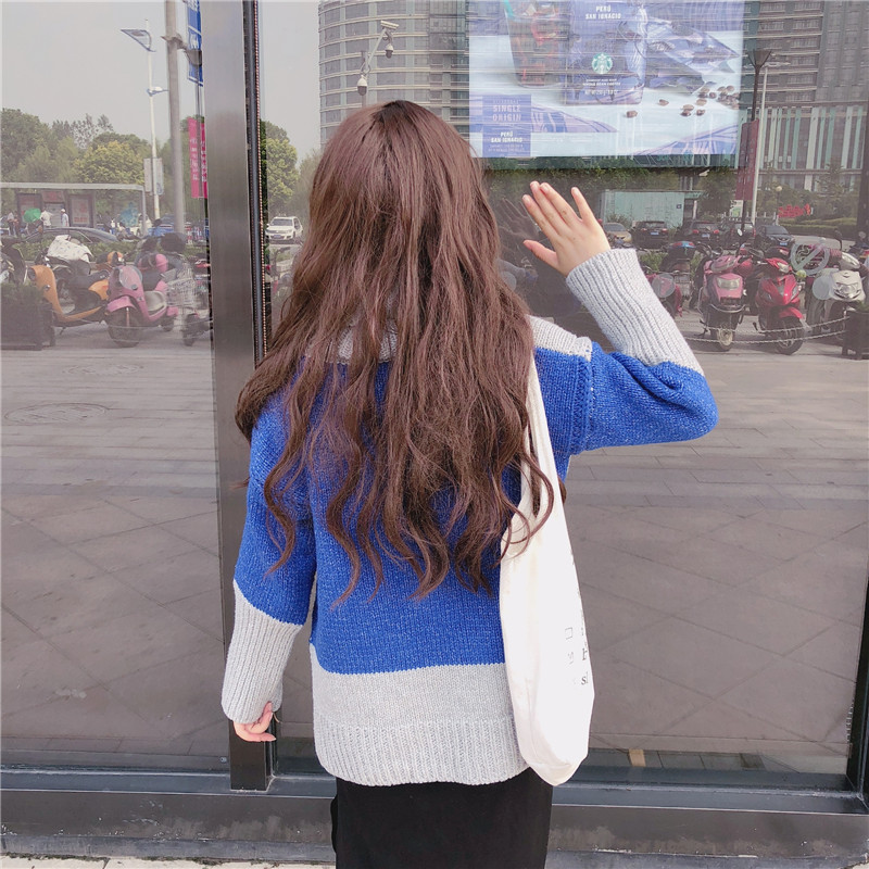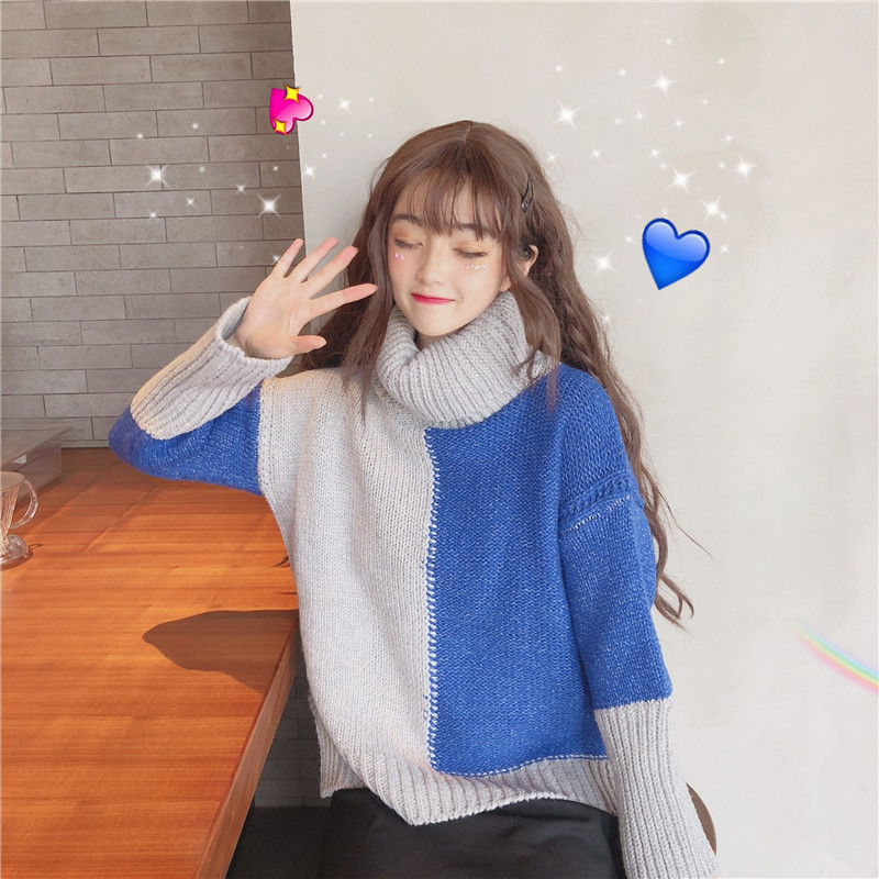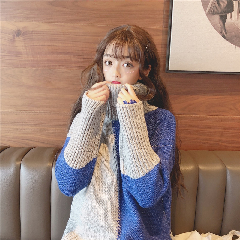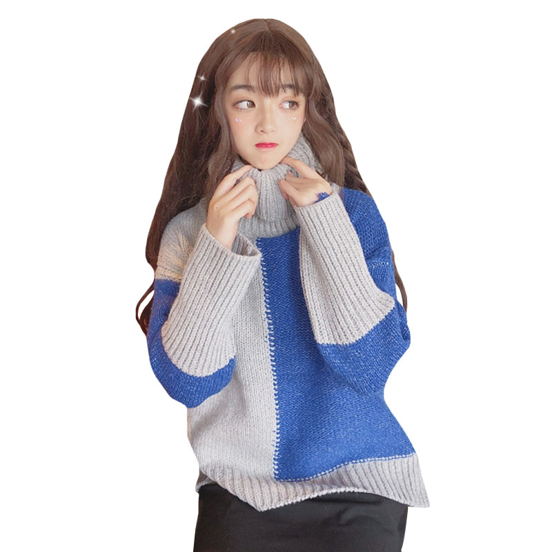 2018新款秋冬韓版寬松高領撞色開叉加厚網紅套頭毛衣針織衫外套女