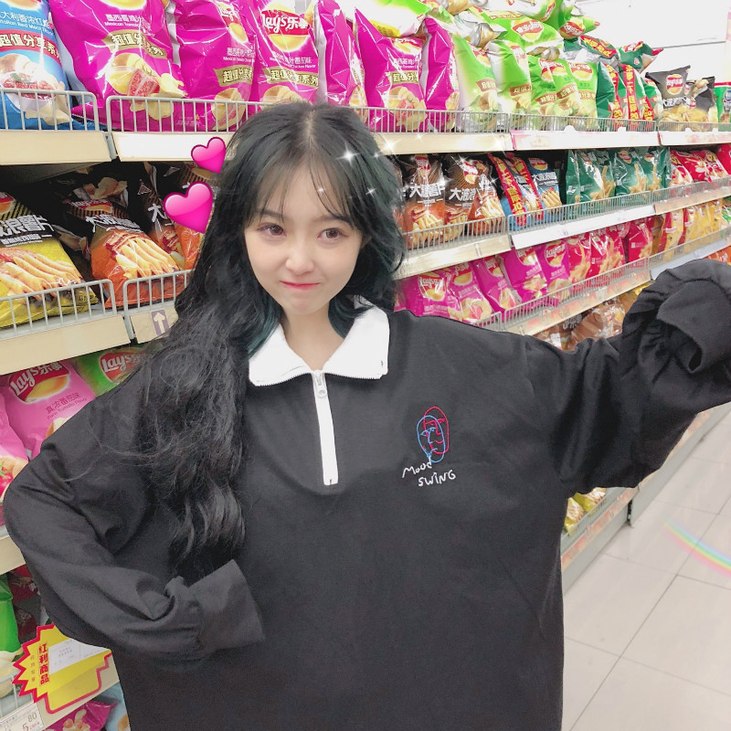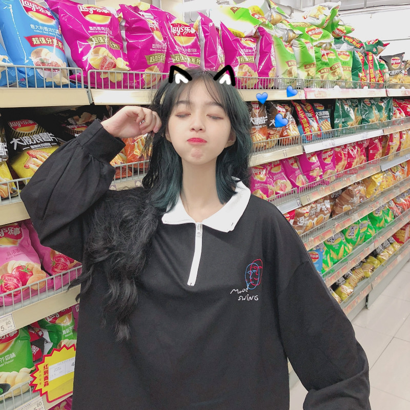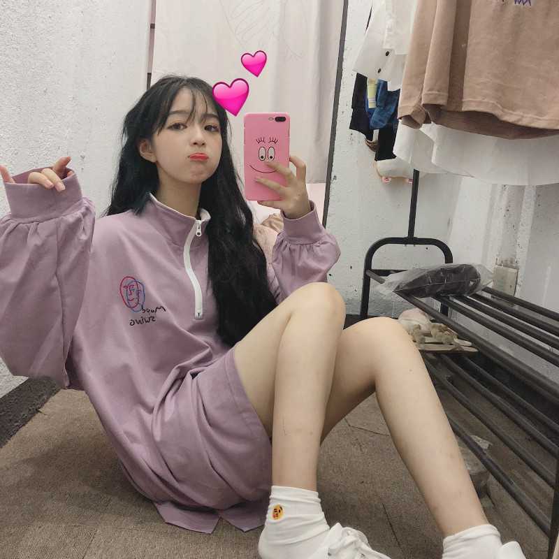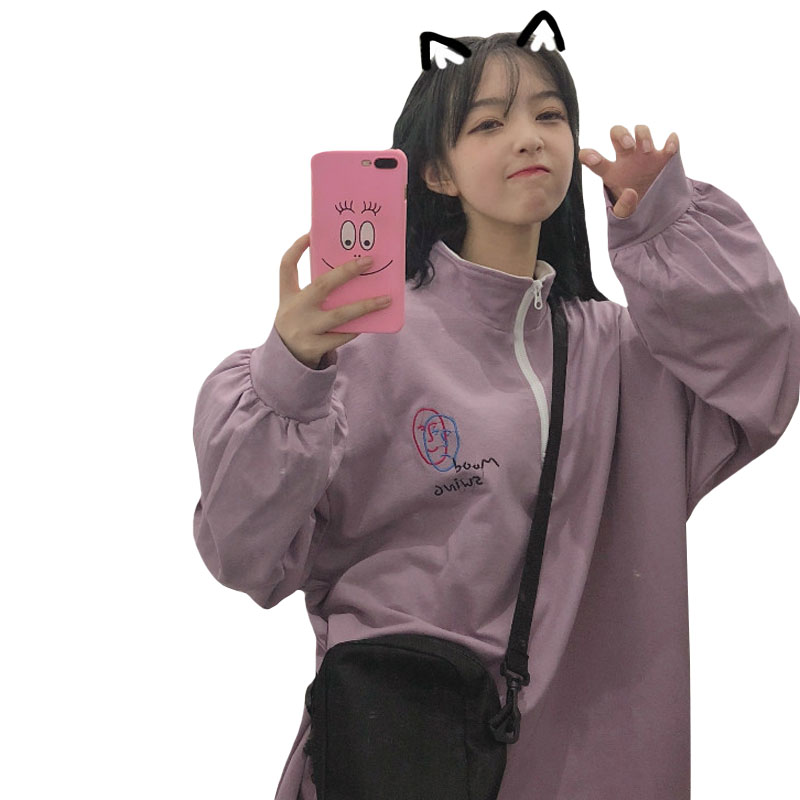 / 秋季女裝韓版中長款BF風寬松Polo領刺繡拉鏈套頭長袖衛衣上衣外套