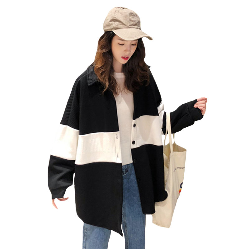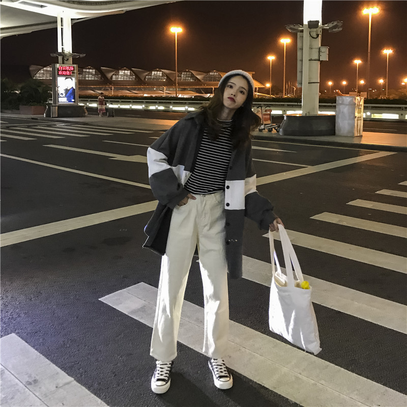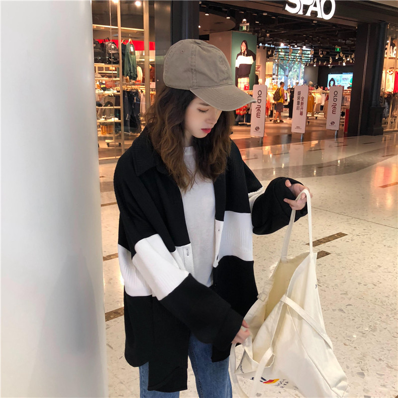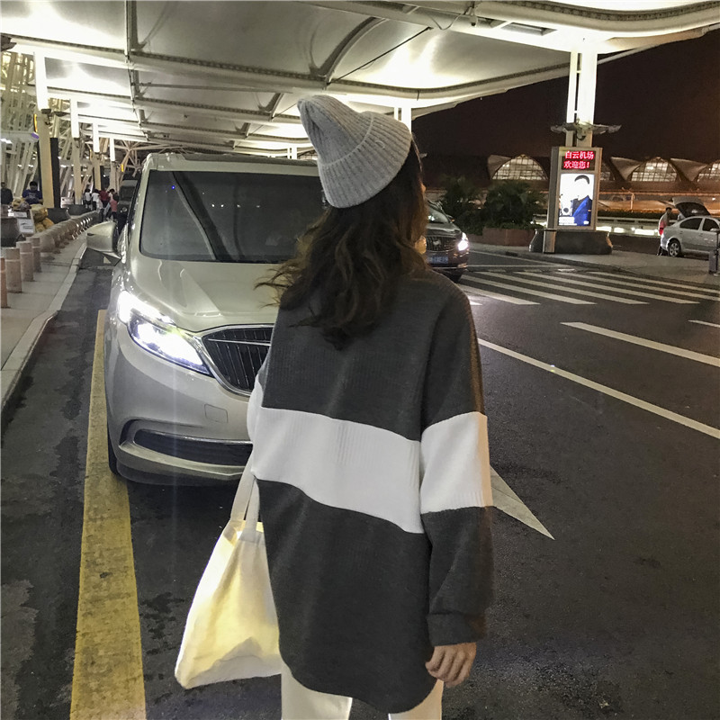 / 秋冬2018新款韓版中長款復古港風條紋BF風寬松針織開衫上衣外套女