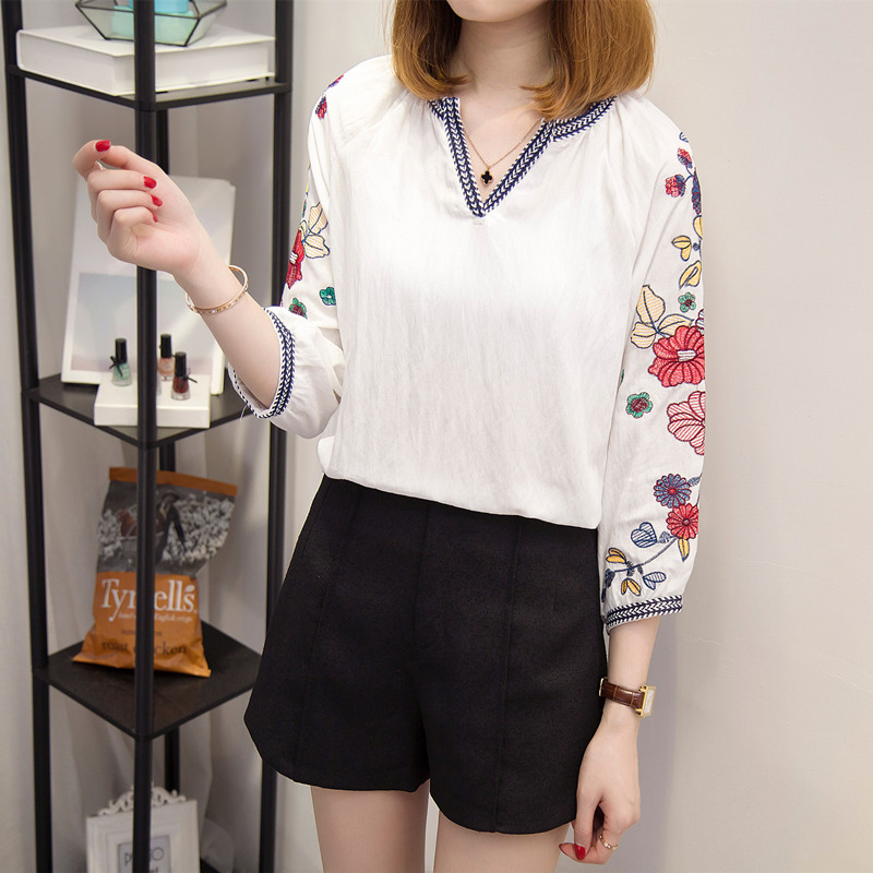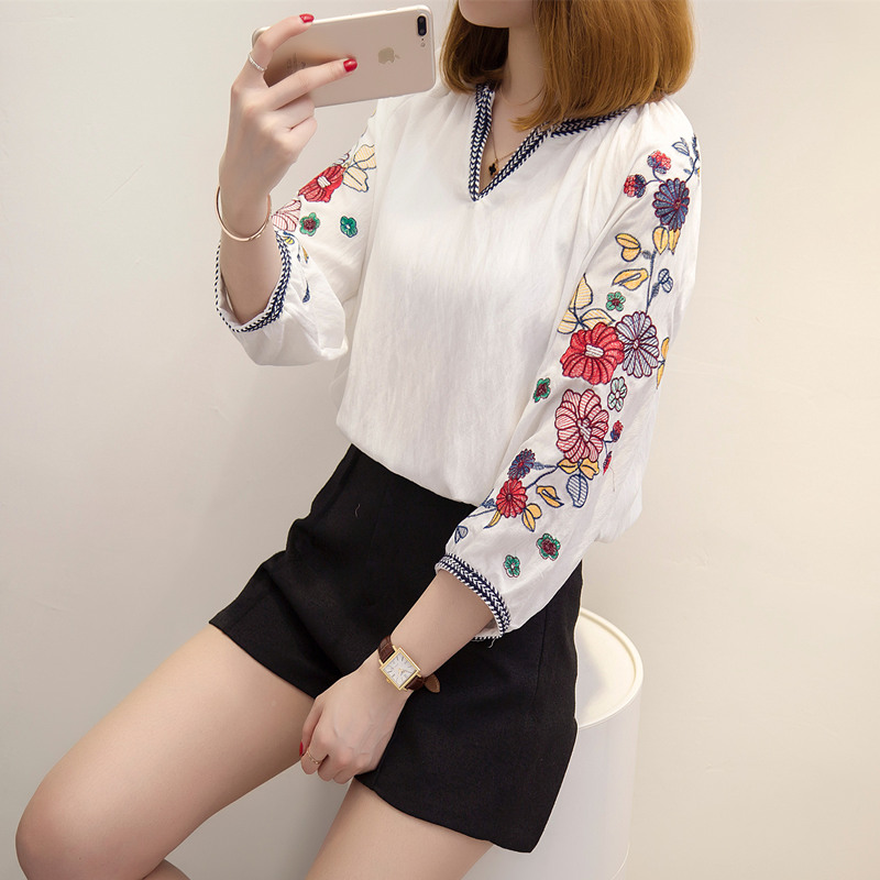 / 春裝新款女裝韓版潮刺繡白色t恤女中長袖寬松花朵打底體恤衫