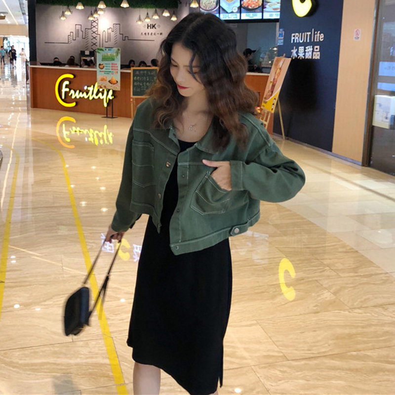 早秋兩件套女裝新款時尚明線長袖牛仔短外套開叉黑色吊帶連衣裙子