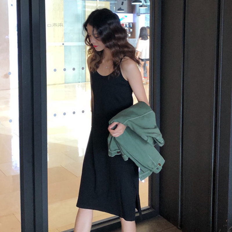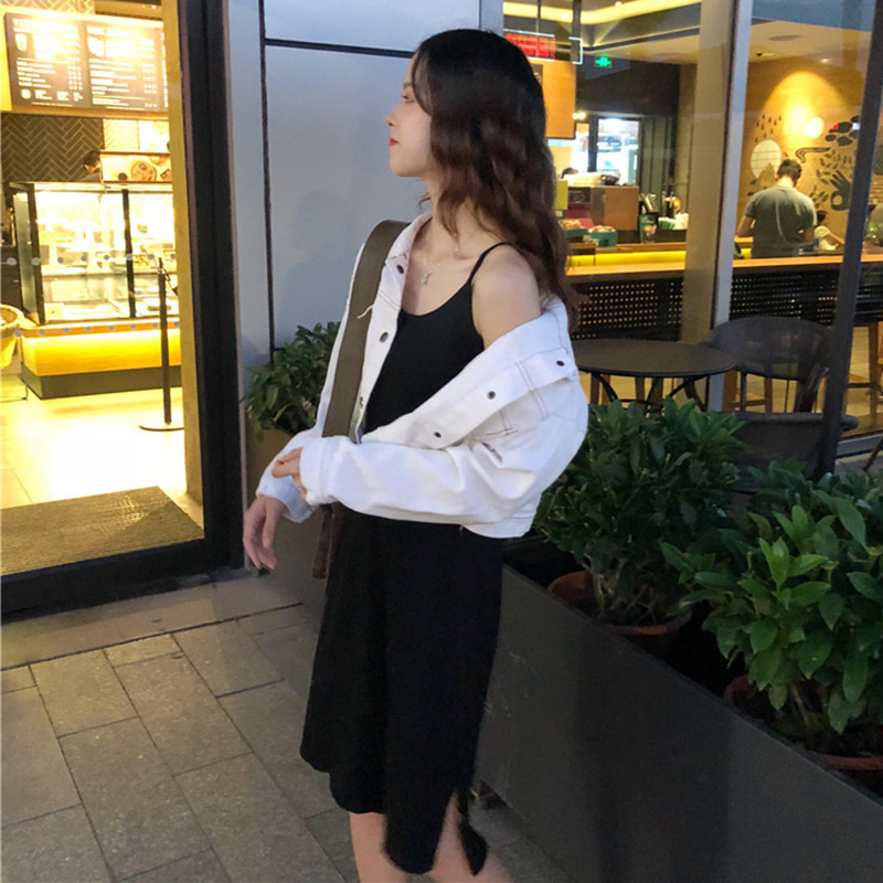 / 早秋兩件套女裝新款時尚明線長袖牛仔短外套開叉黑色吊帶連衣裙子