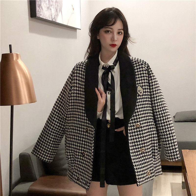 / 秋冬季新款斗篷千鳥格毛呢外套女+洋氣領帶襯衫+排扣呢子短褲套裝