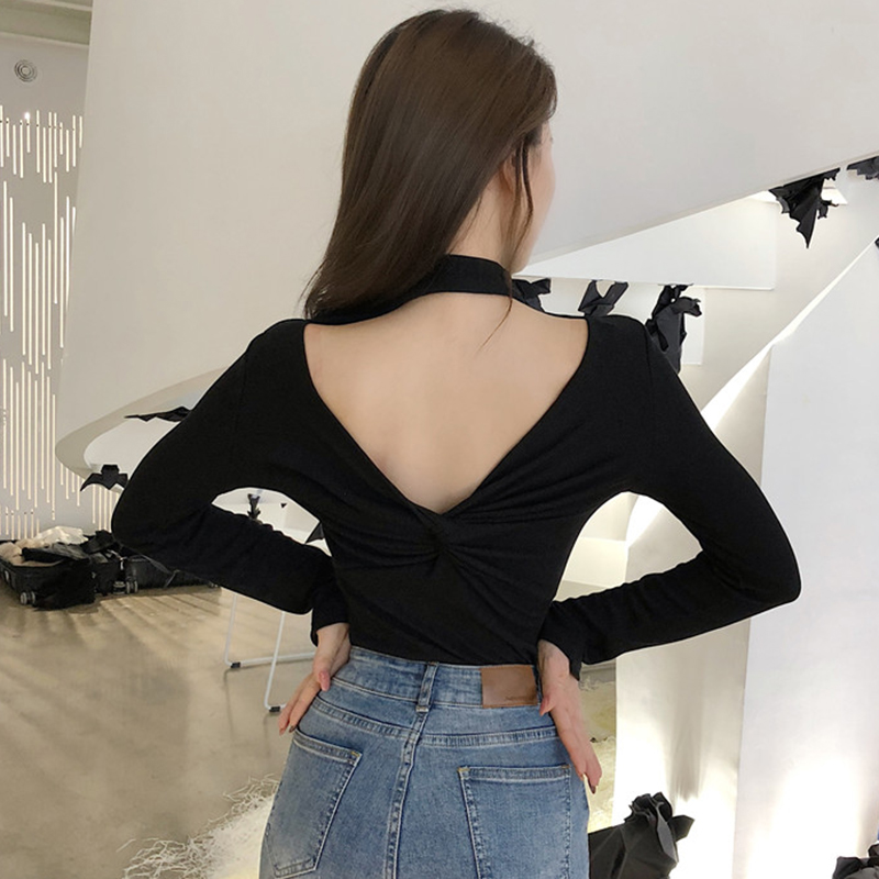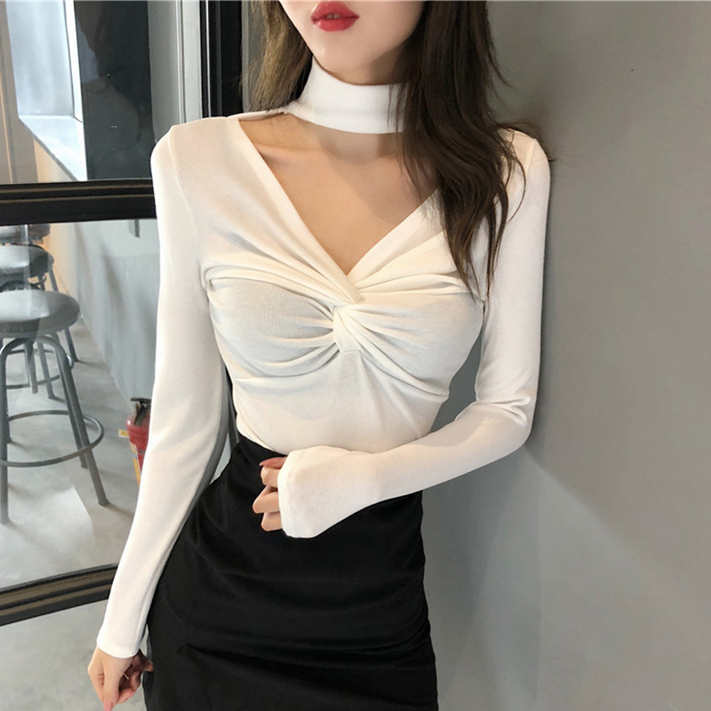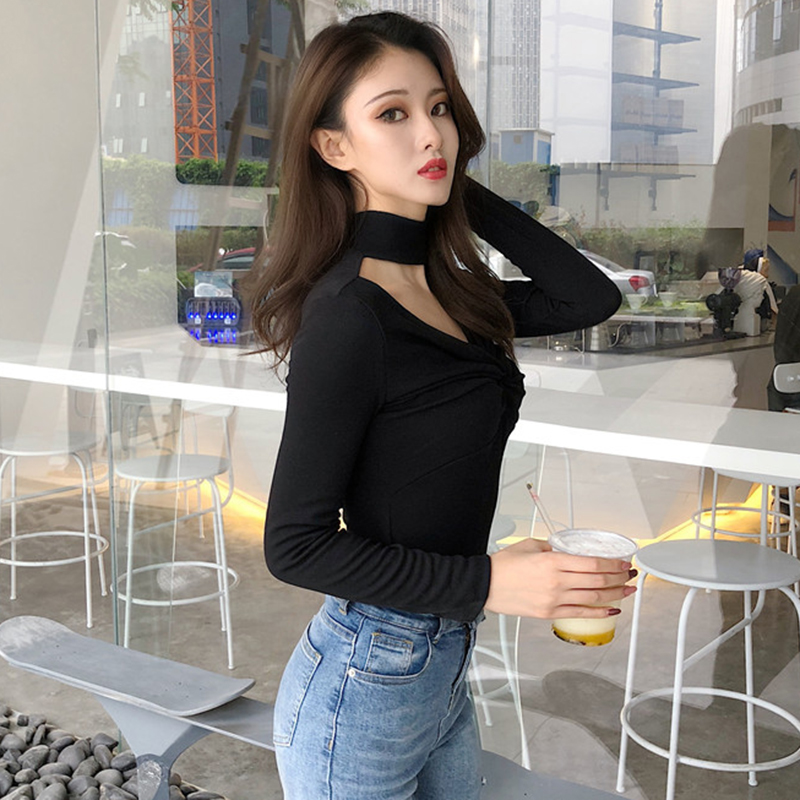 chic兩穿掛脖鏤空打底衫女秋冬裝2018新款韓版心機V領扭結長袖T恤