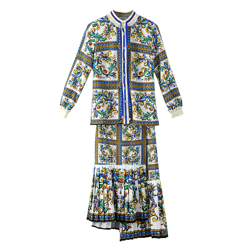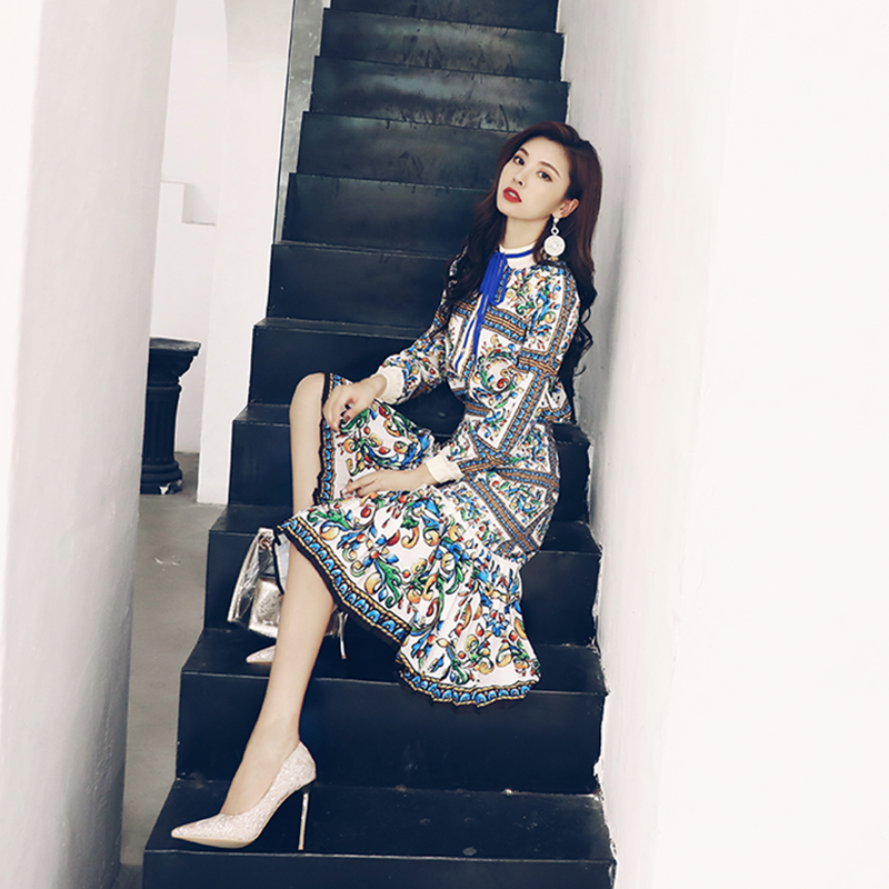 初秋女裙裝新款2018休閑兩件套印花長袖襯衫百褶魚尾裙洋氣套裝潮