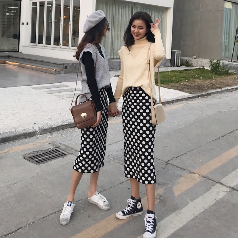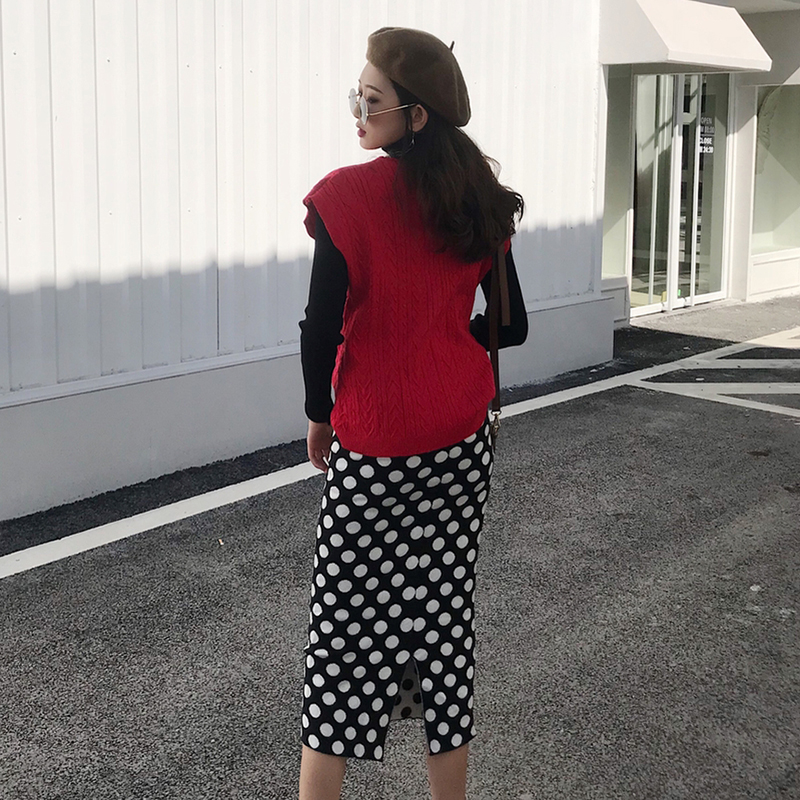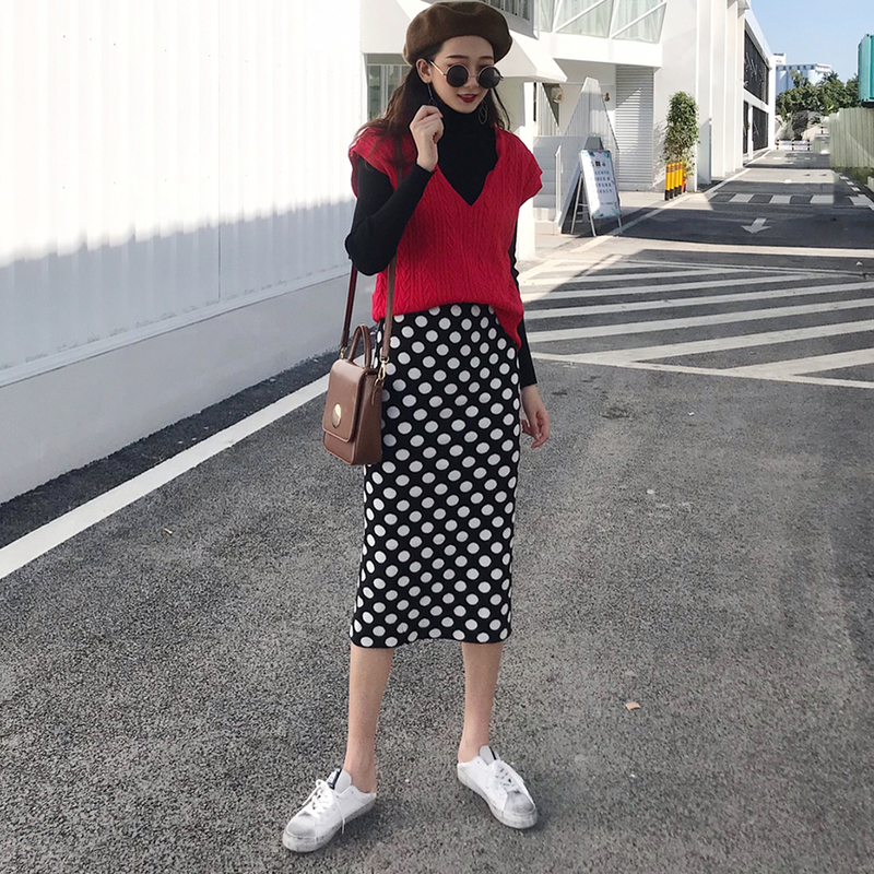 / 套裝女秋冬新款氣質高領打底衫寬松V領毛衣馬甲時尚波點針織長裙