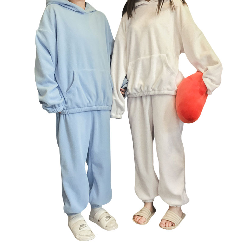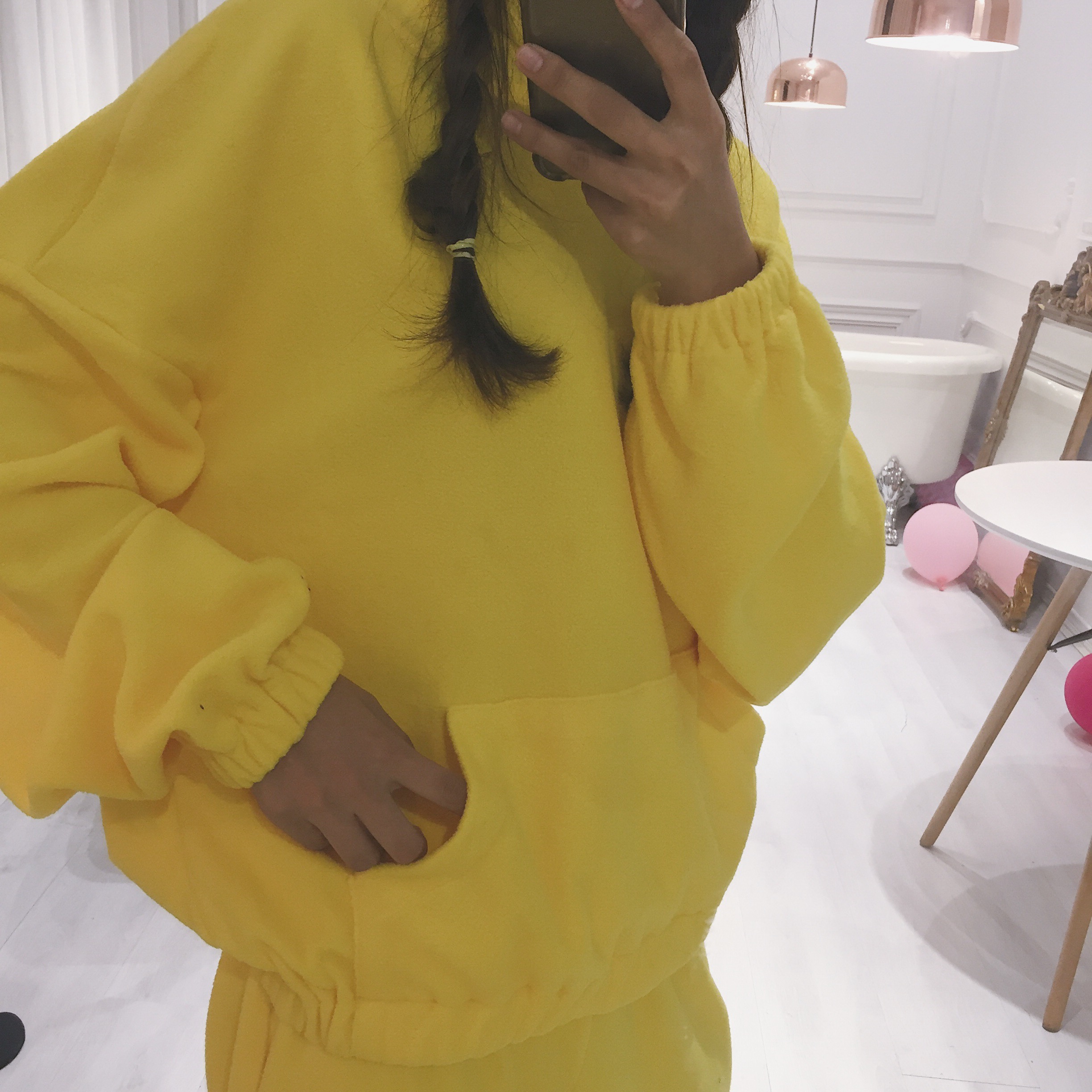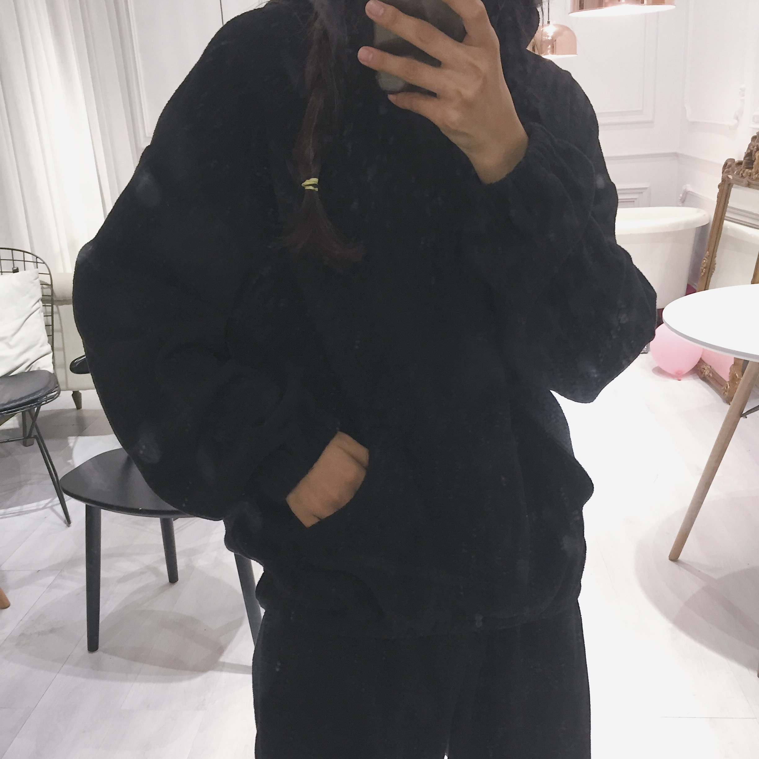 / 秋冬韓版純色絨面家居服套裝寬松加厚保暖長袖睡衣+睡褲兩件套女