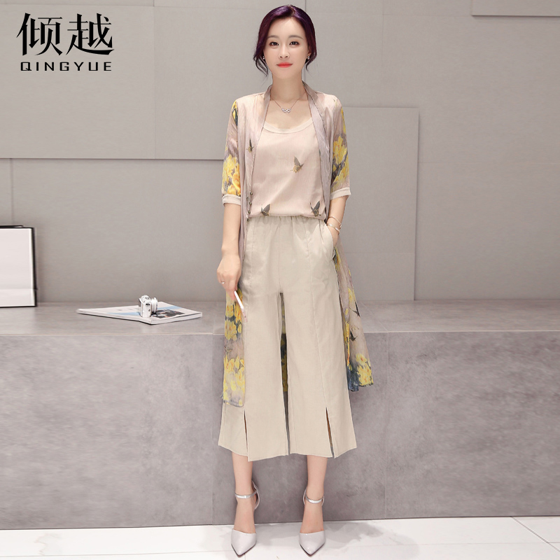 傾越春夏套裝2017新款女裝寬松雪紡上衣七分褲三件套韓版氣質百搭