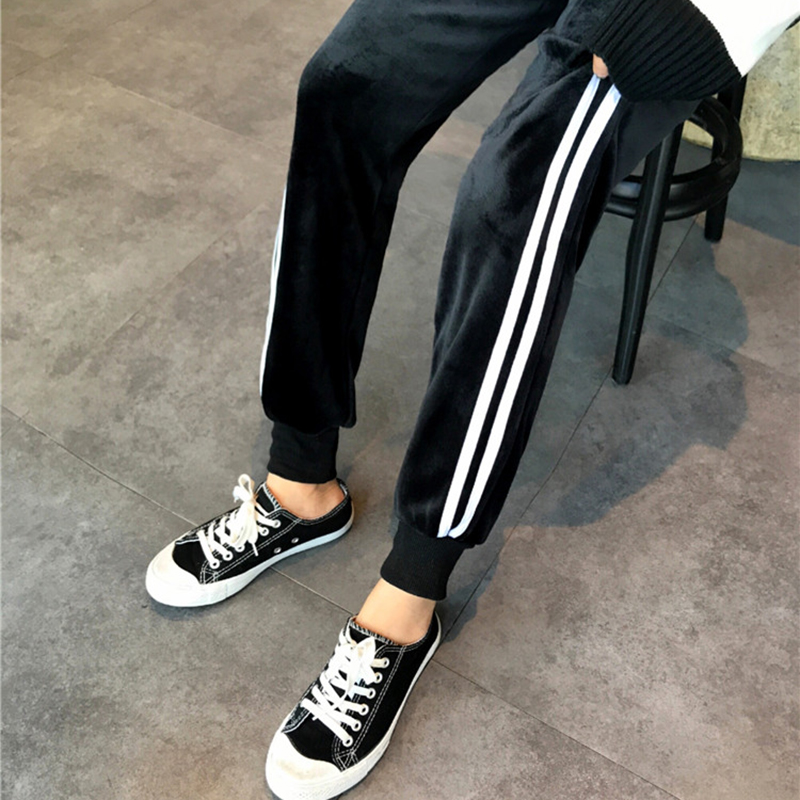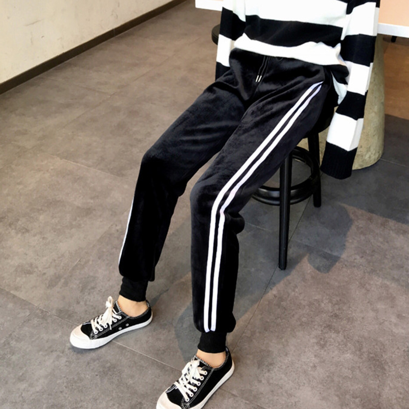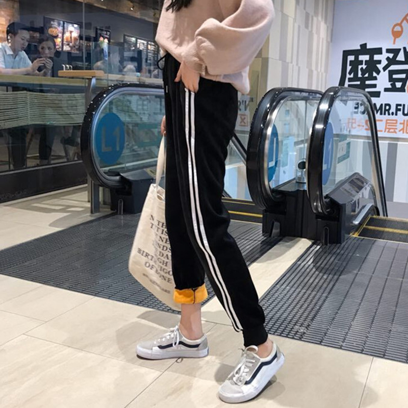 加絨運動褲女冬裝2018新款韓版寬松條紋哈倫褲學生高腰休閑長褲子