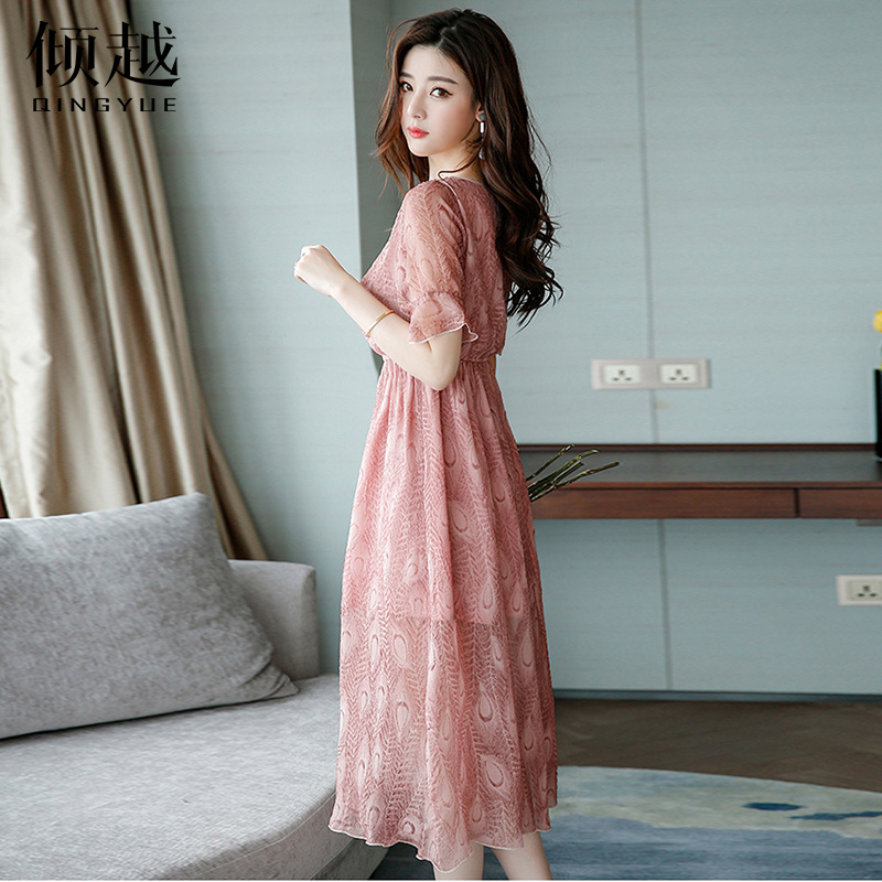 夏季短袖連衣裙女韓版修身顯瘦雪紡長裙甜美仙女裙度假裙2017新款