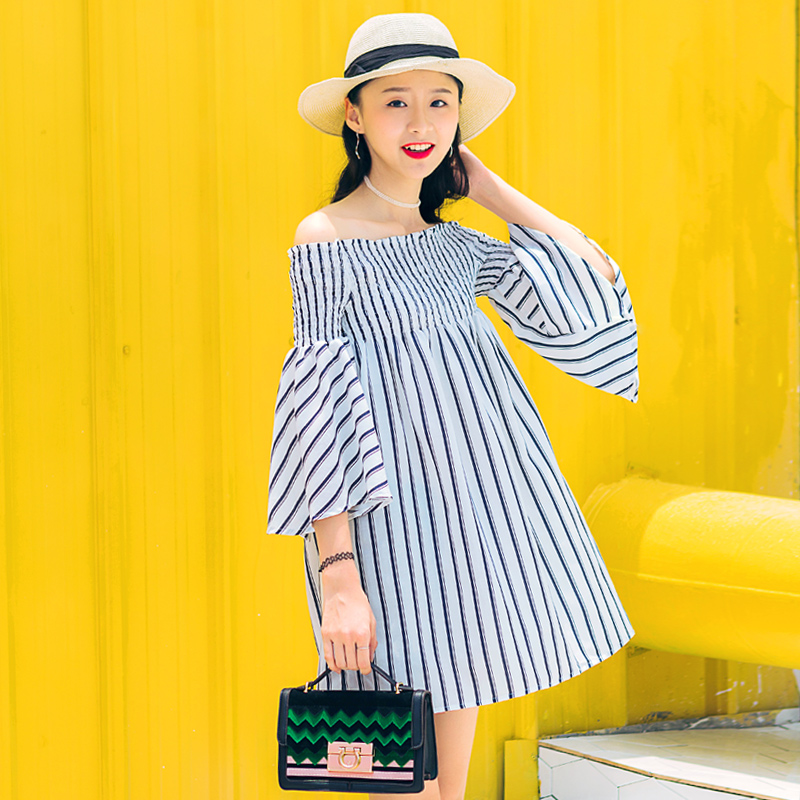 / 一字領露肩條紋連衣裙夏裝新款女裝韓版學生小清新喇叭袖裙子
