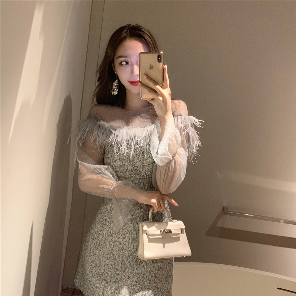 初冬溫柔風女冬裝2018新款時尚高腰羽毛氣質流蘇百搭A字連衣裙女
