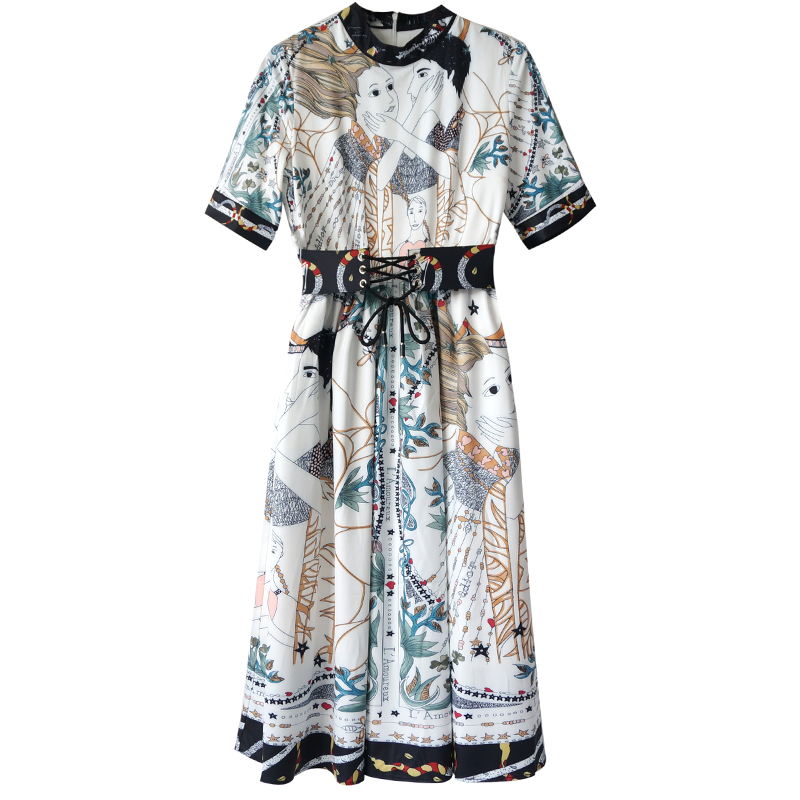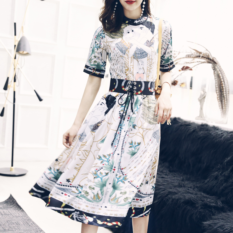 / 名媛修身印花收腰綁帶連衣裙女中長款夏裝新款2018超仙女神范中