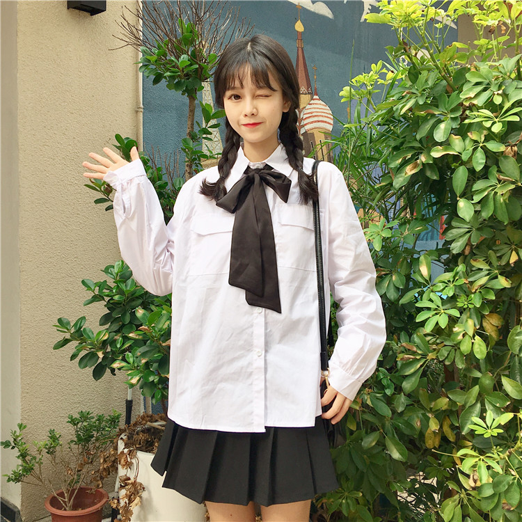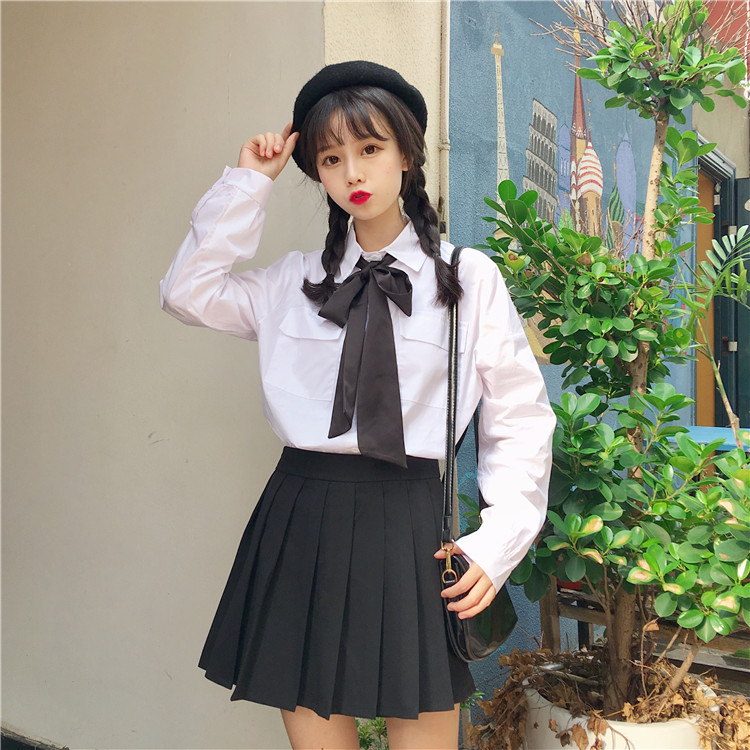 / 韓版時尚休閑套裝秋季女裝寬松領帶長袖襯衫+百褶裙褲短裙兩件套