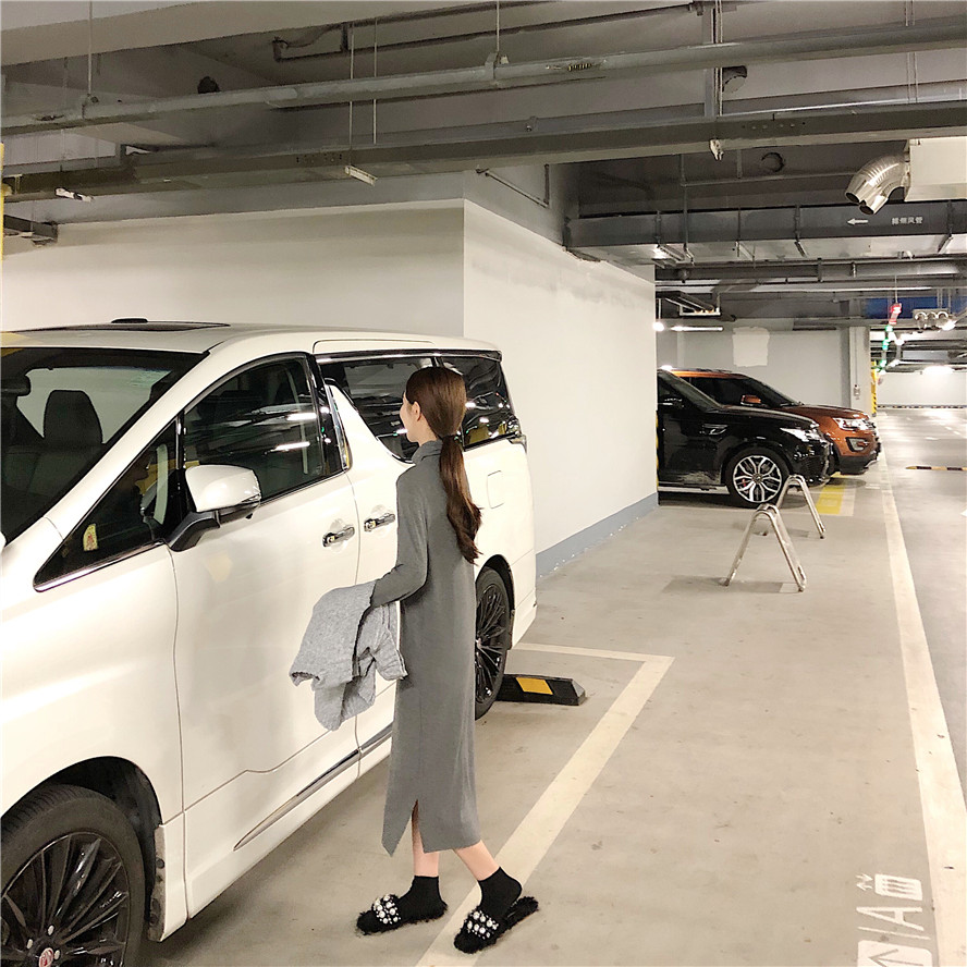 韓版秋裝女2018新款套裝V領針織馬甲女+慵懶打底高領連衣裙兩件套