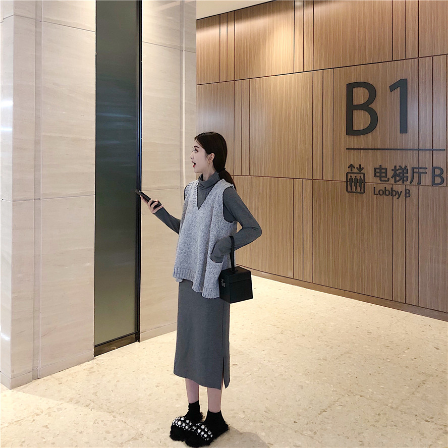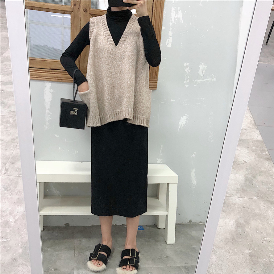 / 韓版秋裝女2018新款套裝V領針織馬甲女+慵懶打底高領連衣裙兩件套