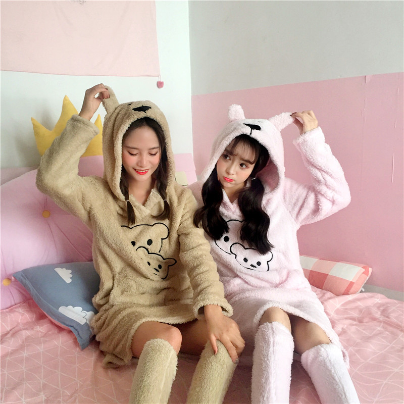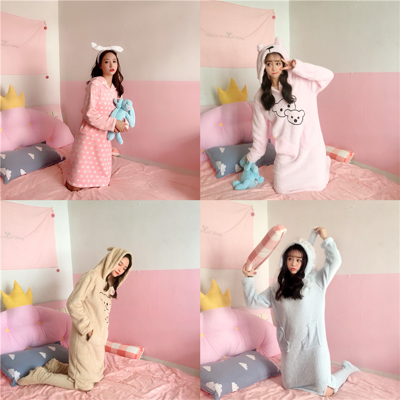 / 秋冬韓版甜美可愛學生睡裙珊瑚絨寬松中長款睡衣裙子女+保暖長襪