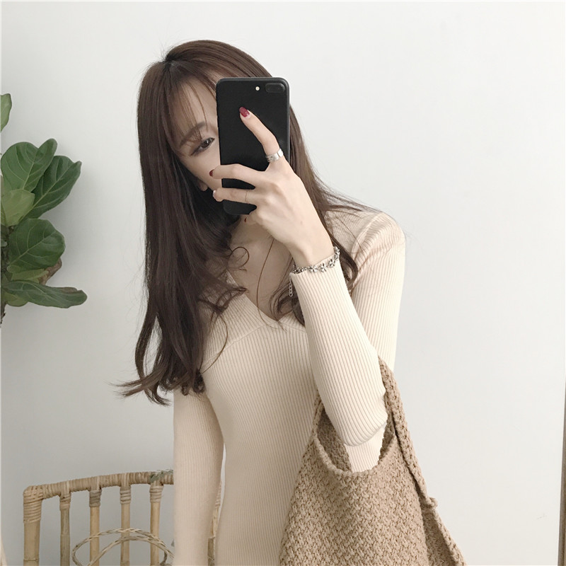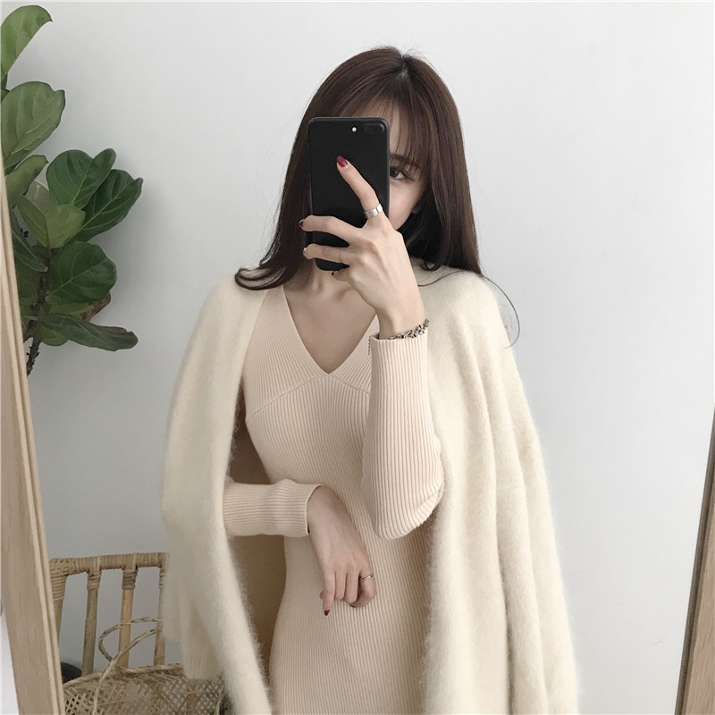 / 韓版網紅毛衣女慵懶風修身顯瘦打底針織連衣裙長袖V領毛衣長裙潮