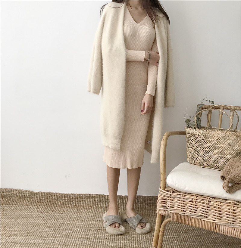 馬海毛網紅毛衣女2018新款針織開衫外套冷淡風針織吊帶連衣裙套裝