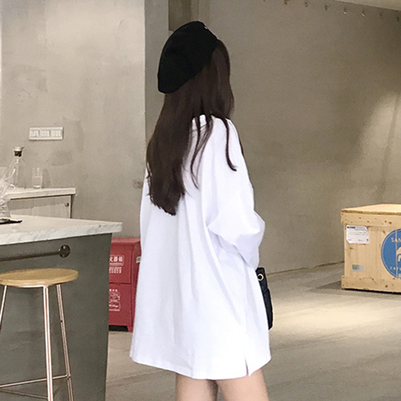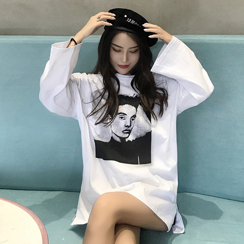 / 時尚人物印花T恤女秋裝新款圓領寬松長袖體恤開叉中長款休閑上衣